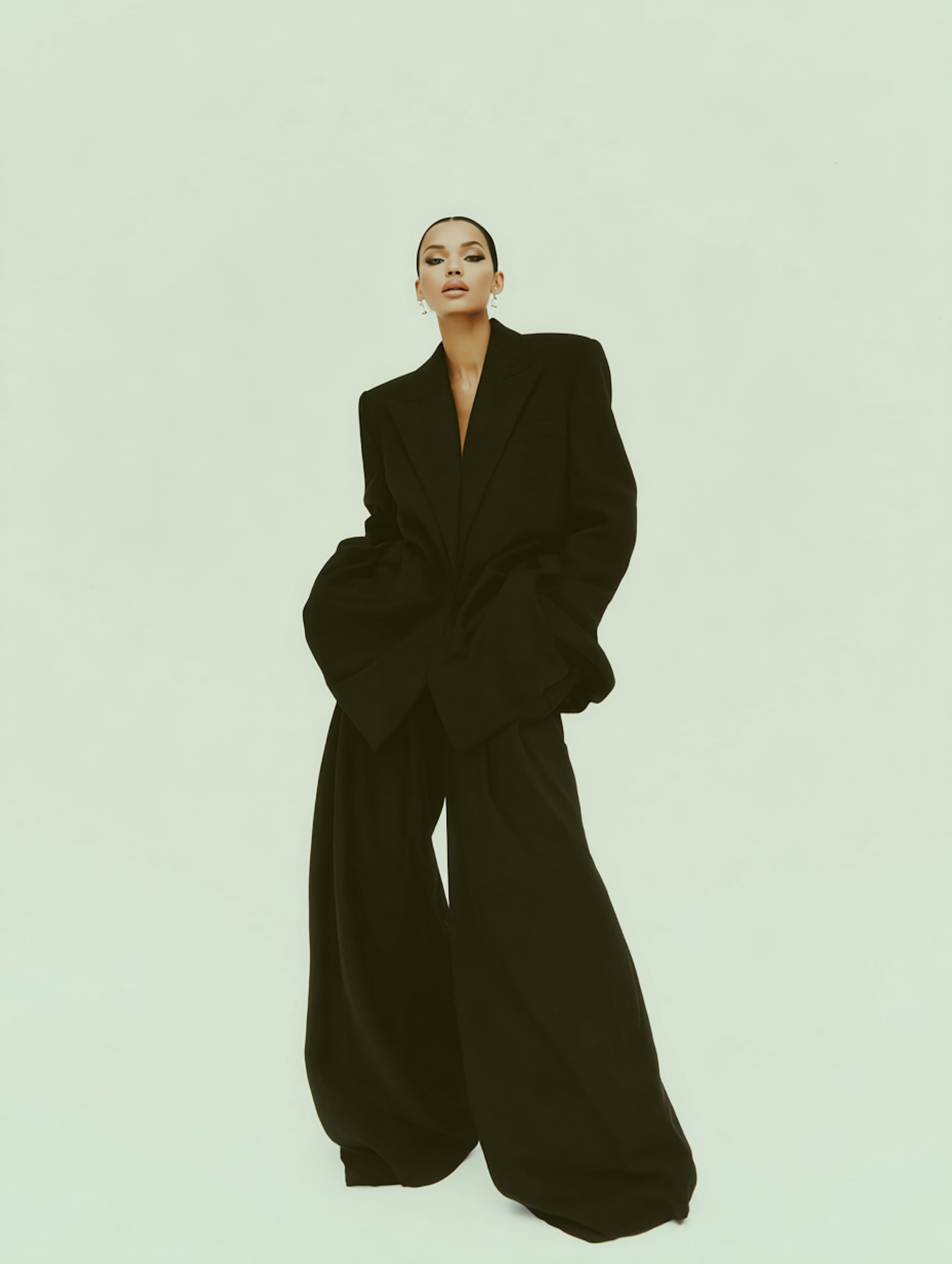 A person in an oversized black suit poses against a light background, showcasing a minimalist and bold fashion statement.