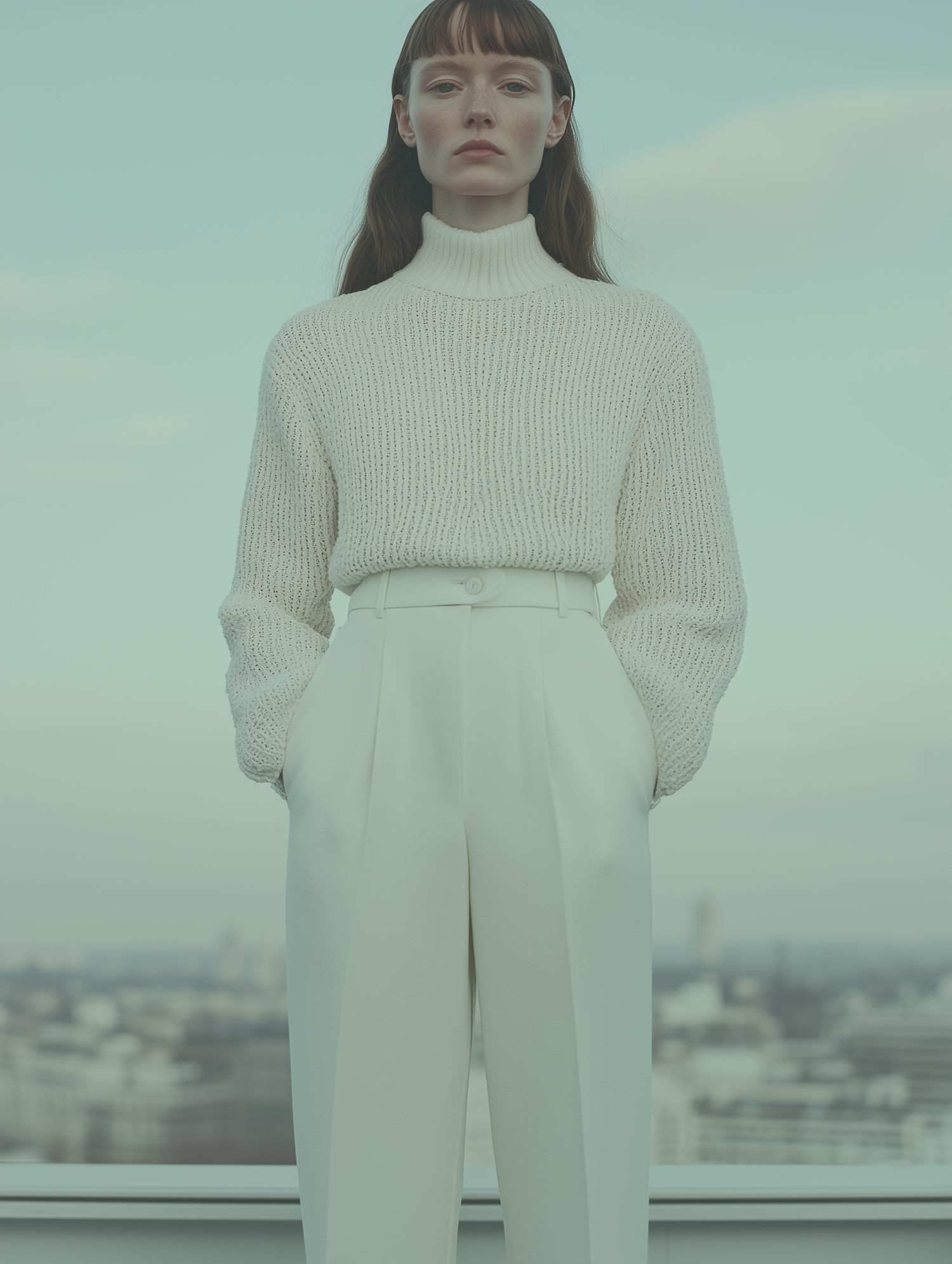 Minimalist fashion portrait of a woman in a white knit sweater and trousers, set against a pastel sky and urban rooftop backdrop.