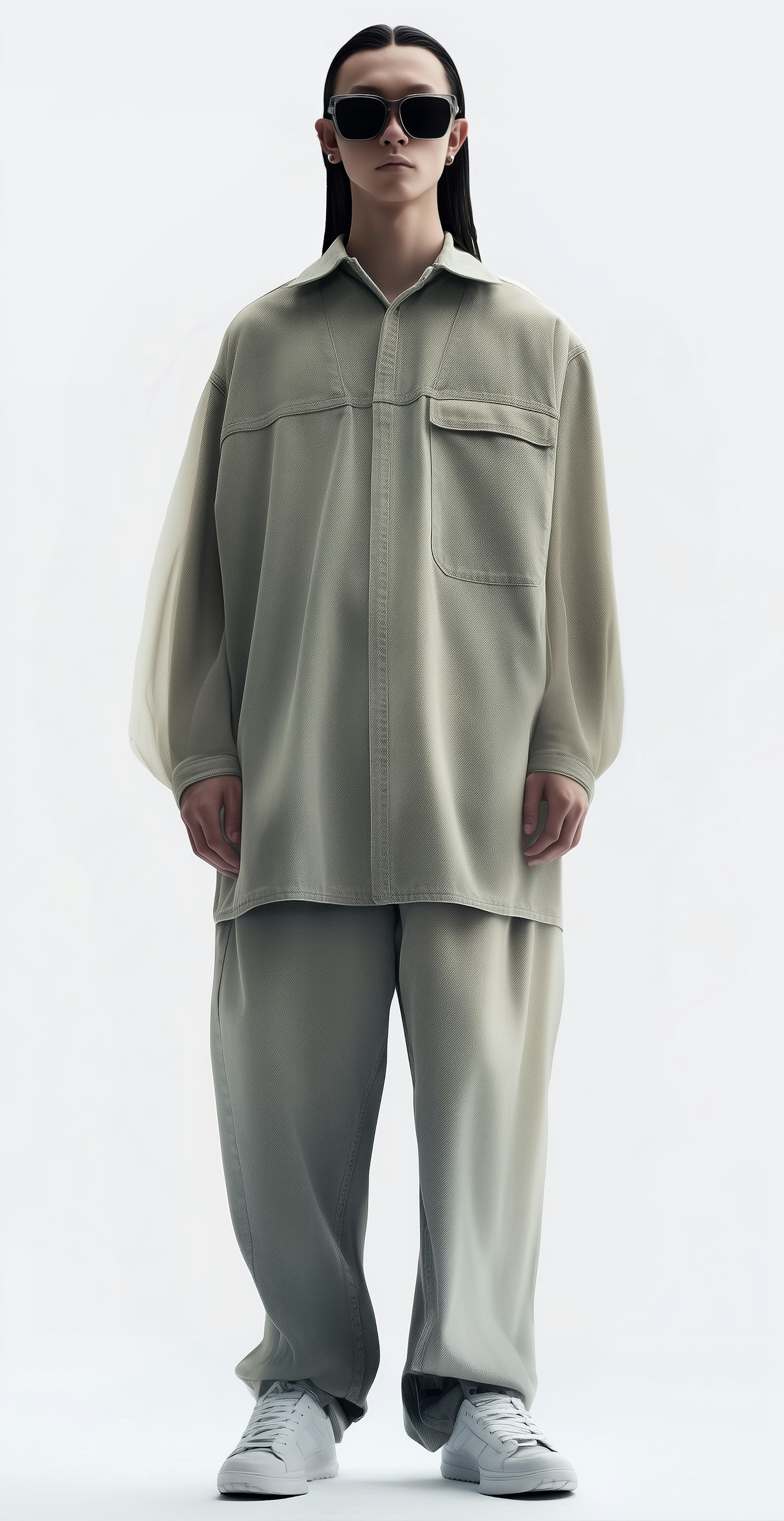 A person in a minimalist beige outfit with sunglasses and white sneakers, standing against a neutral background.