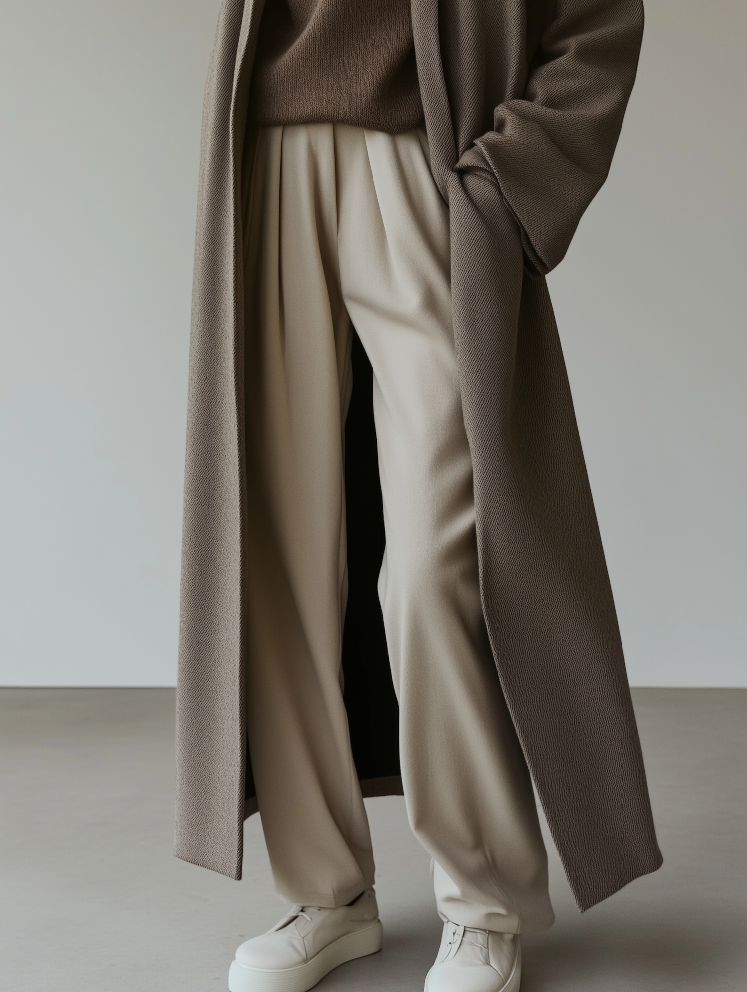 Minimalist fashion with taupe coat, beige trousers, and white sneakers. Elegant and modern style in neutral tones.