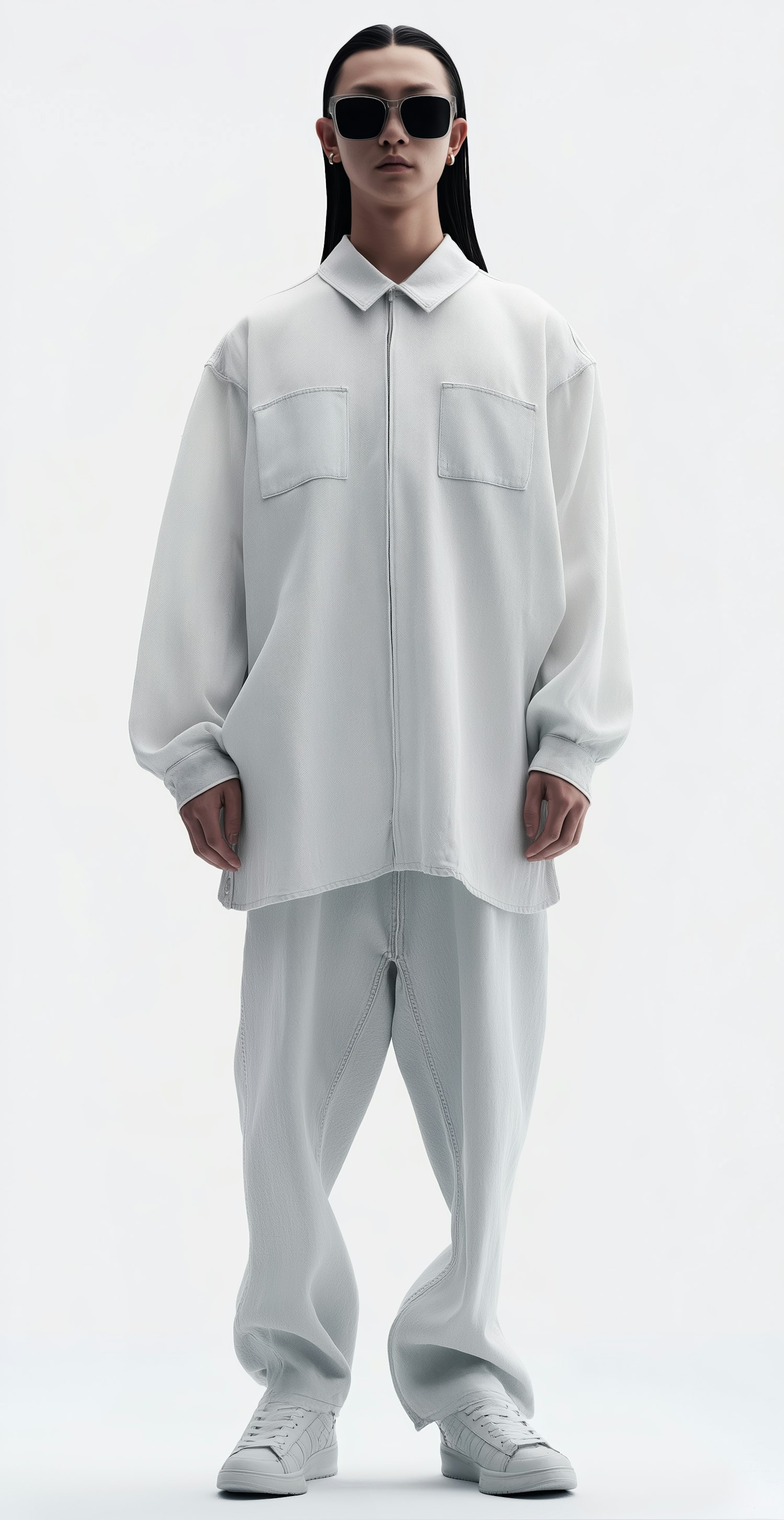 A stylish individual in a monochromatic white outfit with sleek black hair and sunglasses, exuding a minimalist and modern vibe.
