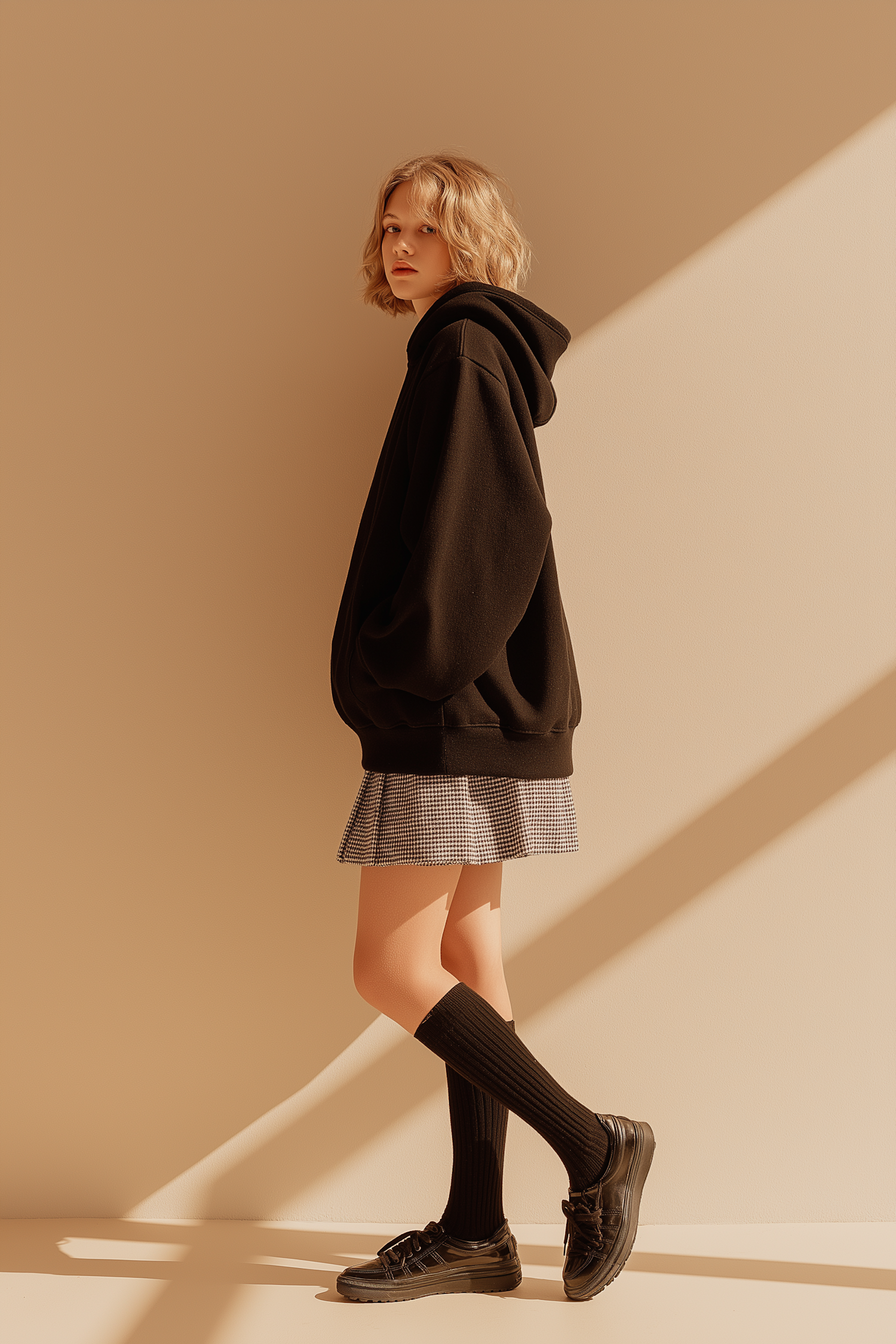 A person in a black hoodie and checkered skirt stands in soft lighting, creating a minimalist and stylish composition.