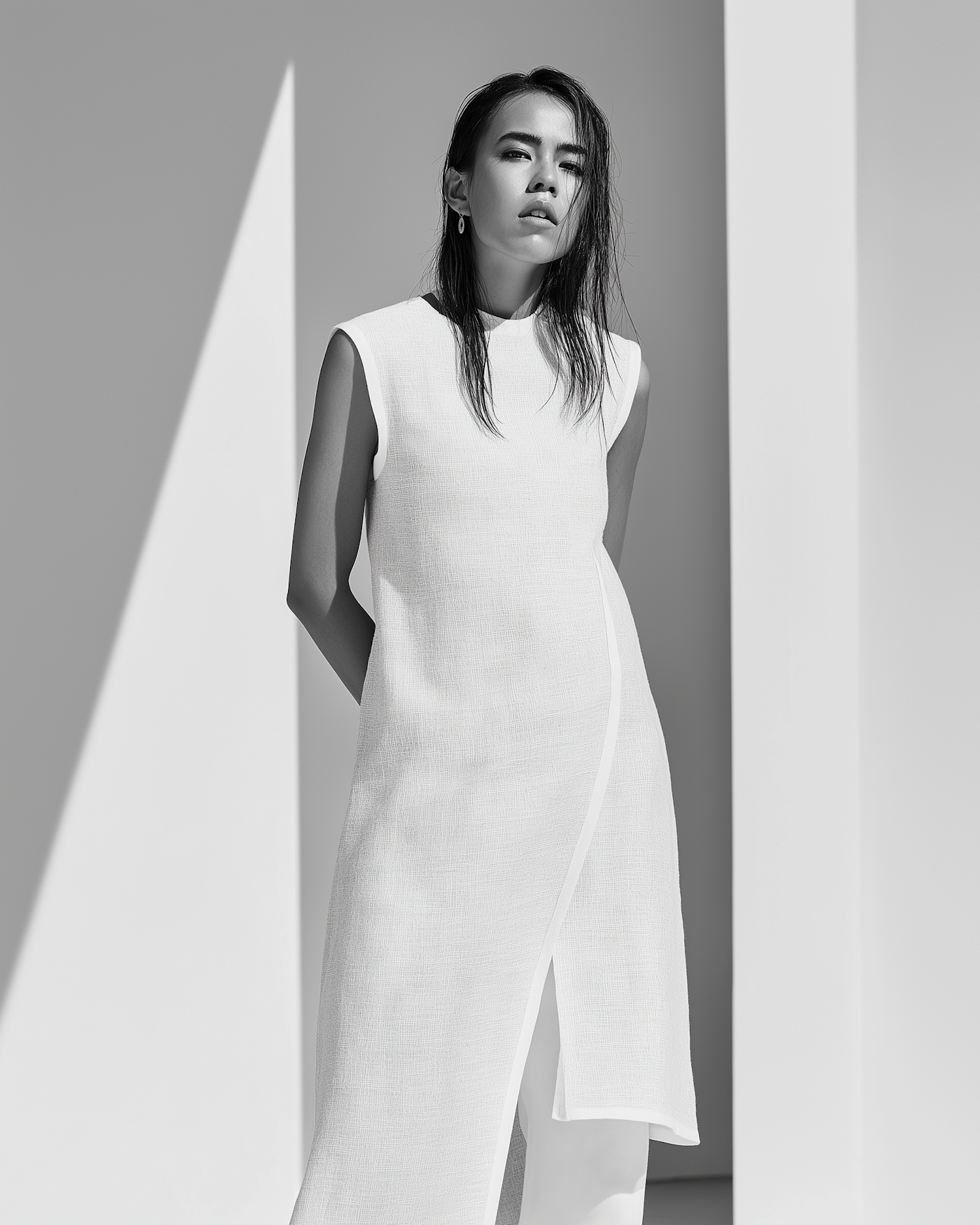 Monochromatic photo of a person in minimalist white attire with a modern, artistic vibe highlighted by sharp contrasts and shadows.