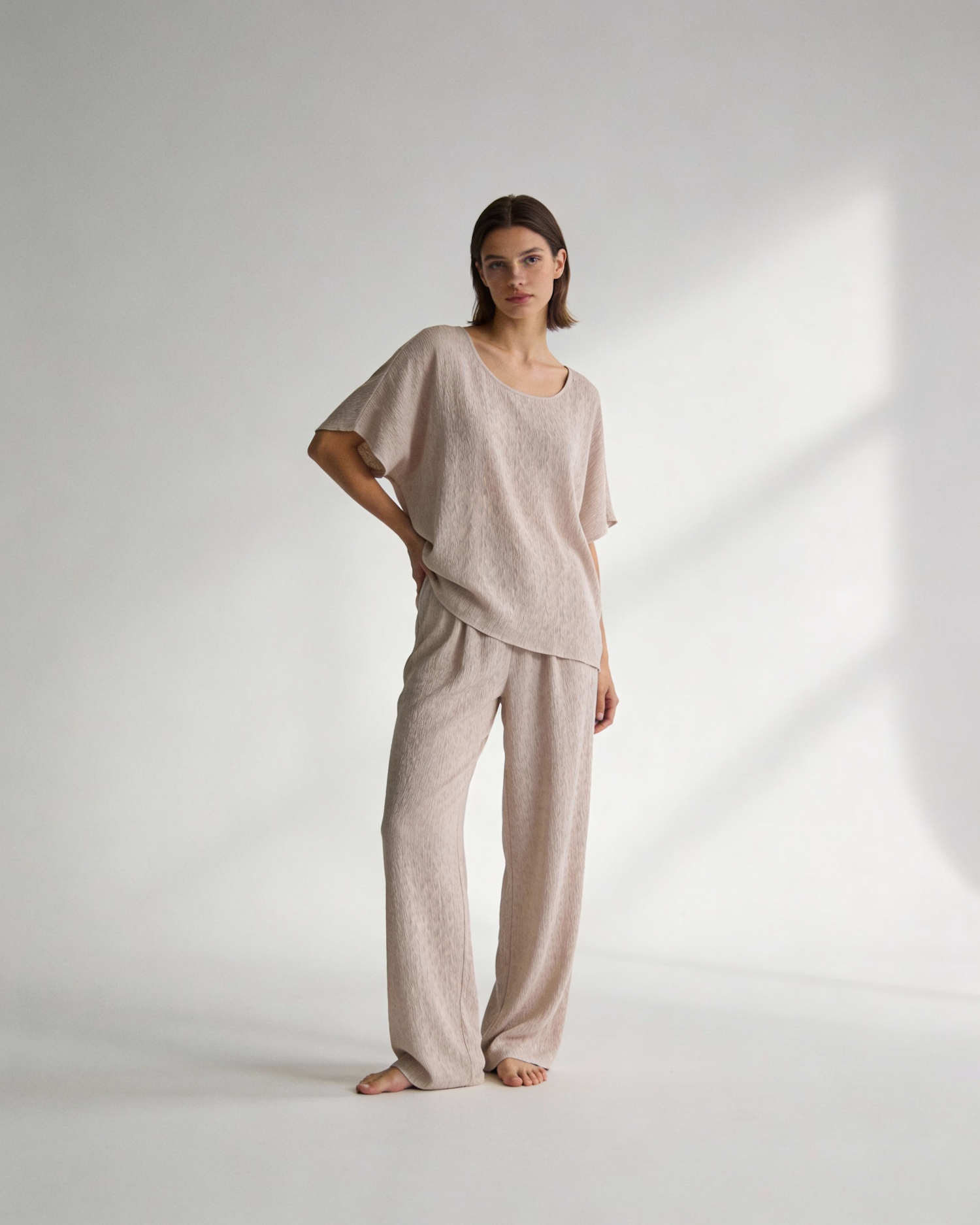 A woman in a beige, relaxed outfit stands in a minimalist setting with soft lighting, showcasing a comfortable and stylish look.