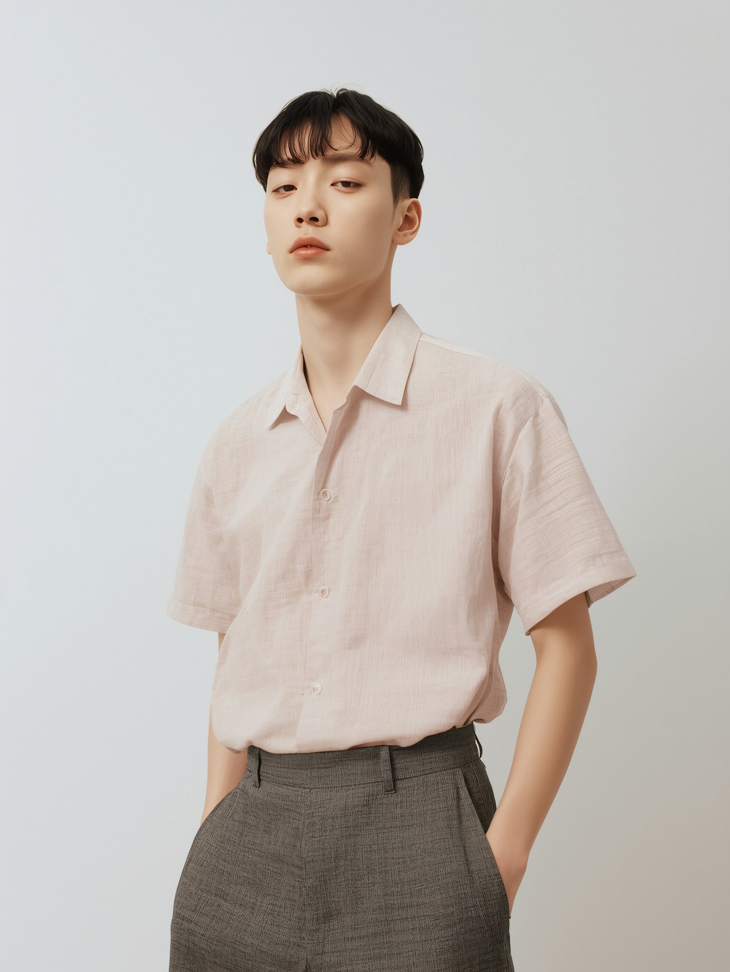Minimalist portrait of a young man in a light pink shirt and gray trousers, standing against a plain background.