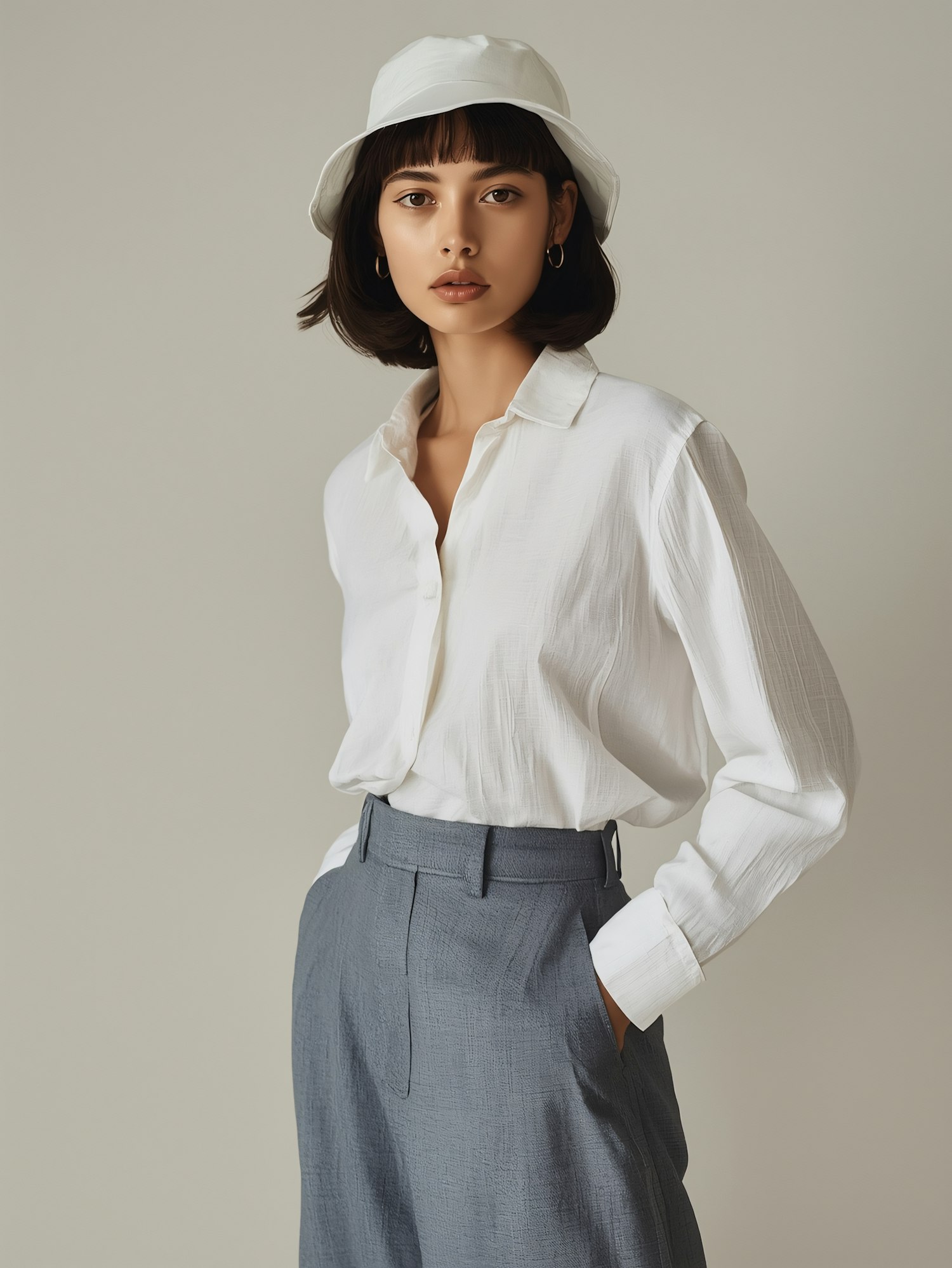 Stylish woman in a white shirt, gray trousers, and bucket hat, showcasing minimalist fashion against a neutral background.