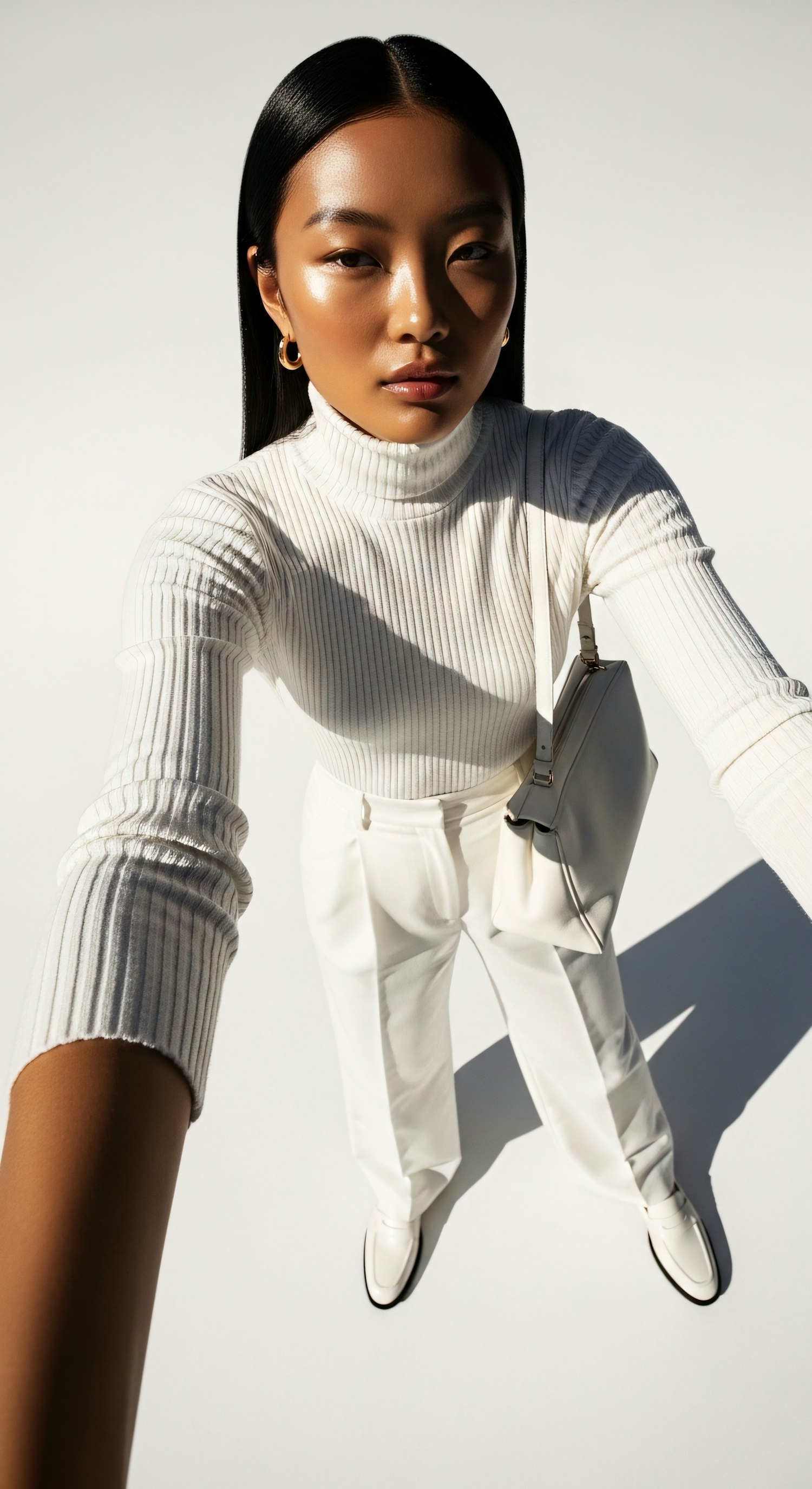 A stylish individual in a white outfit with sleek black hair and gold earrings, standing against a bright minimalist background.