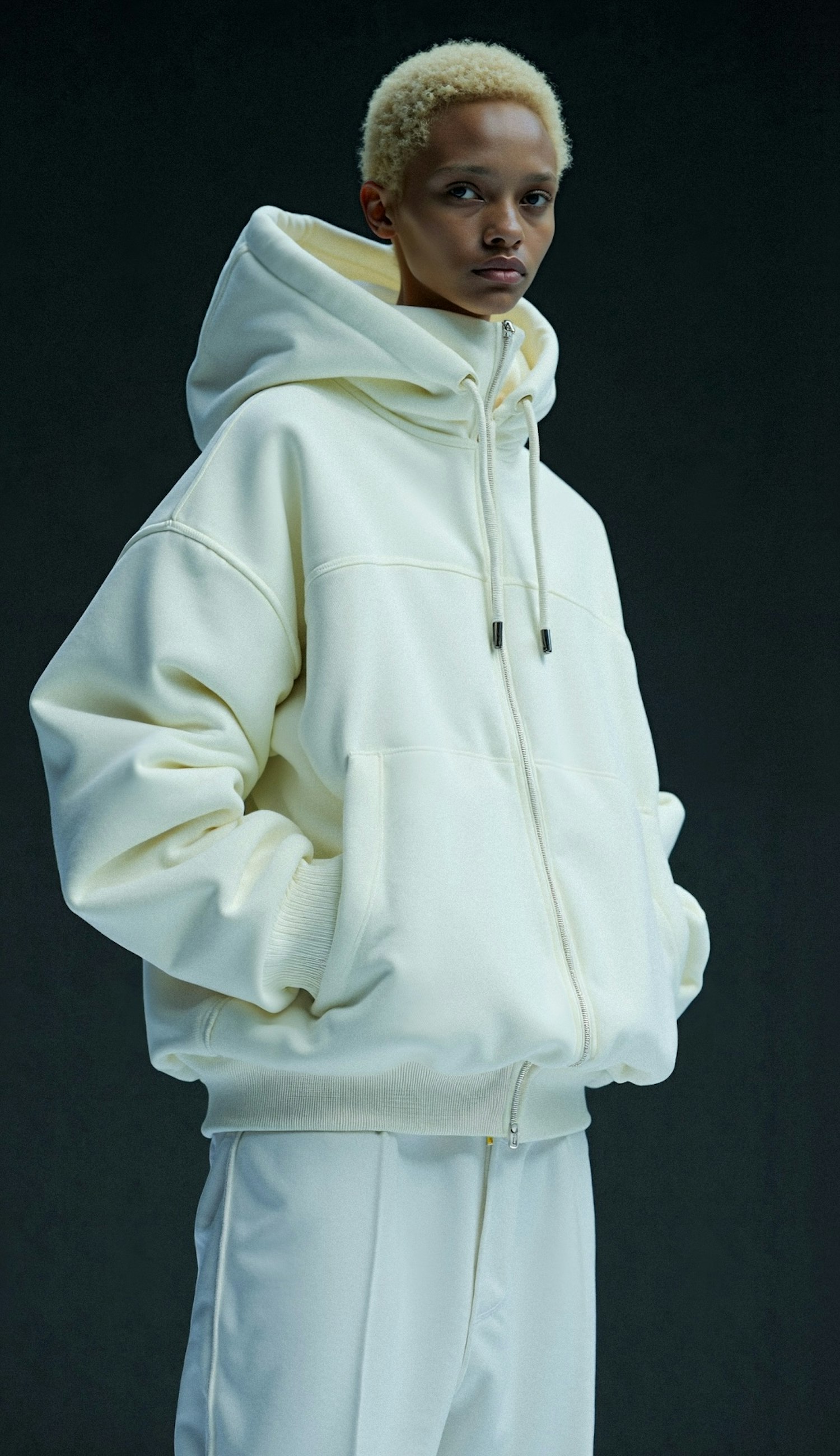 Person in cream hoodie and pants, short blonde hair, calm expression, minimalist fashion against dark background.
