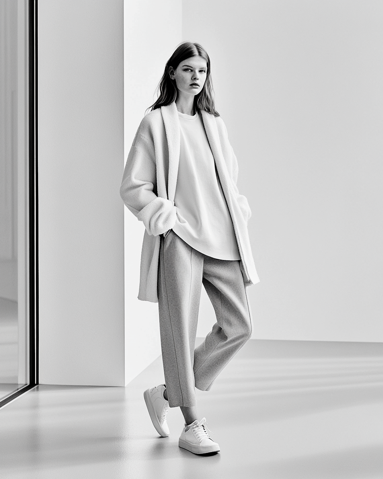 Minimalist fashion look with a young woman in a white coat, gray trousers, and sneakers in a modern, light-filled space.