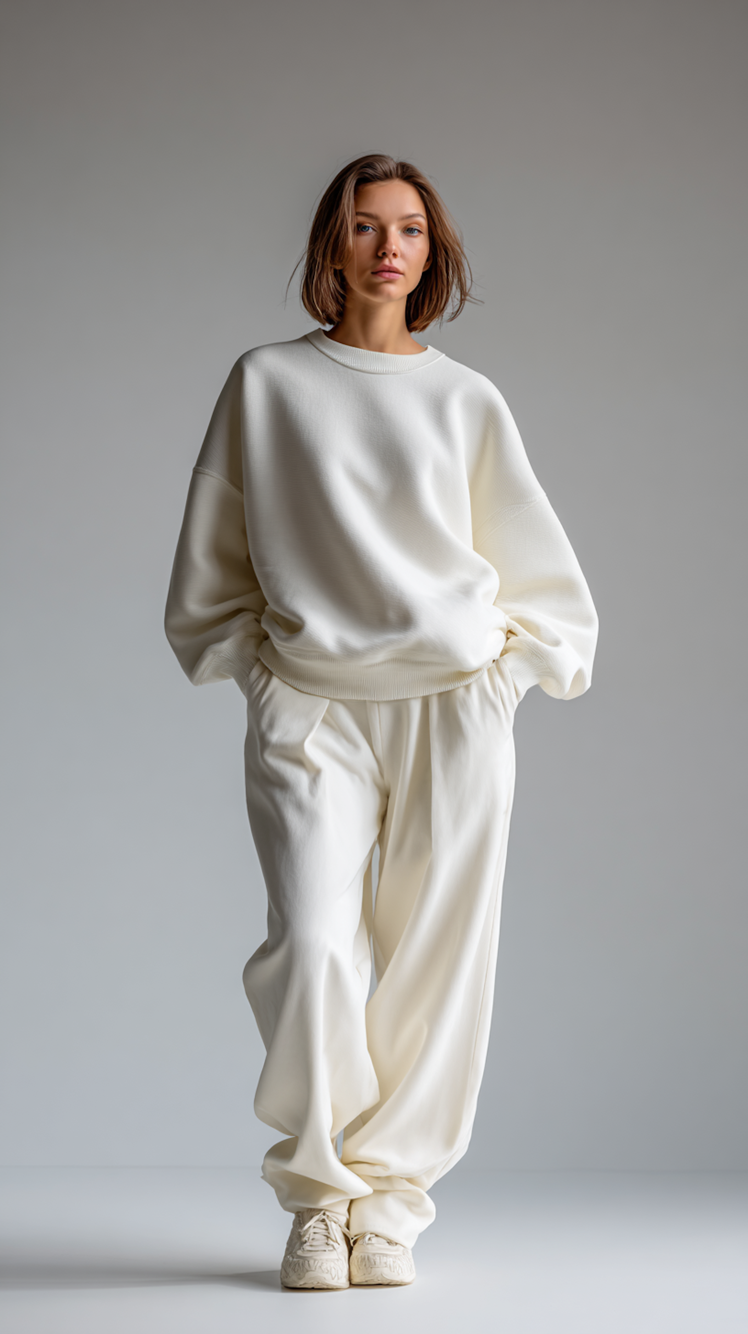 A person in a white oversized sweatshirt and loose pants stands confidently in a minimalistic setting, showcasing a relaxed style.