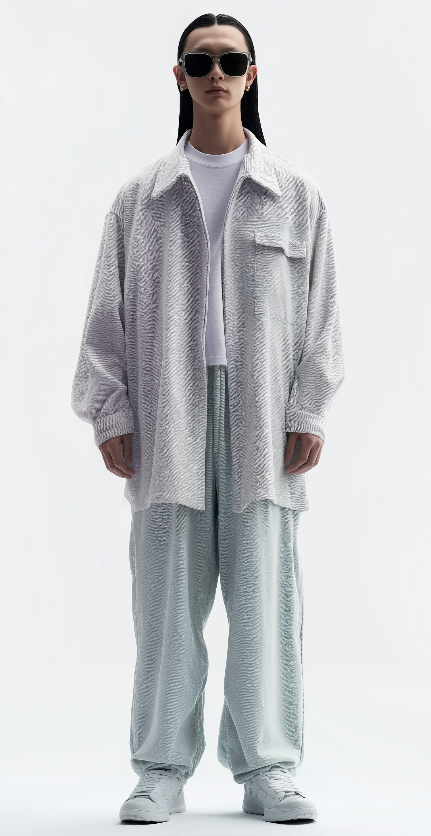 A stylish individual in a monochromatic outfit with sleek black hair and sunglasses, standing against a plain white background.