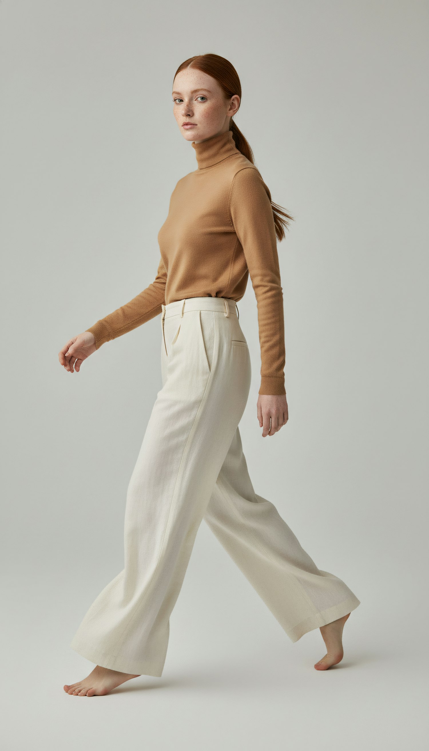 A person in a tan turtleneck and white trousers walks barefoot against a neutral background, showcasing minimalist style and movement.