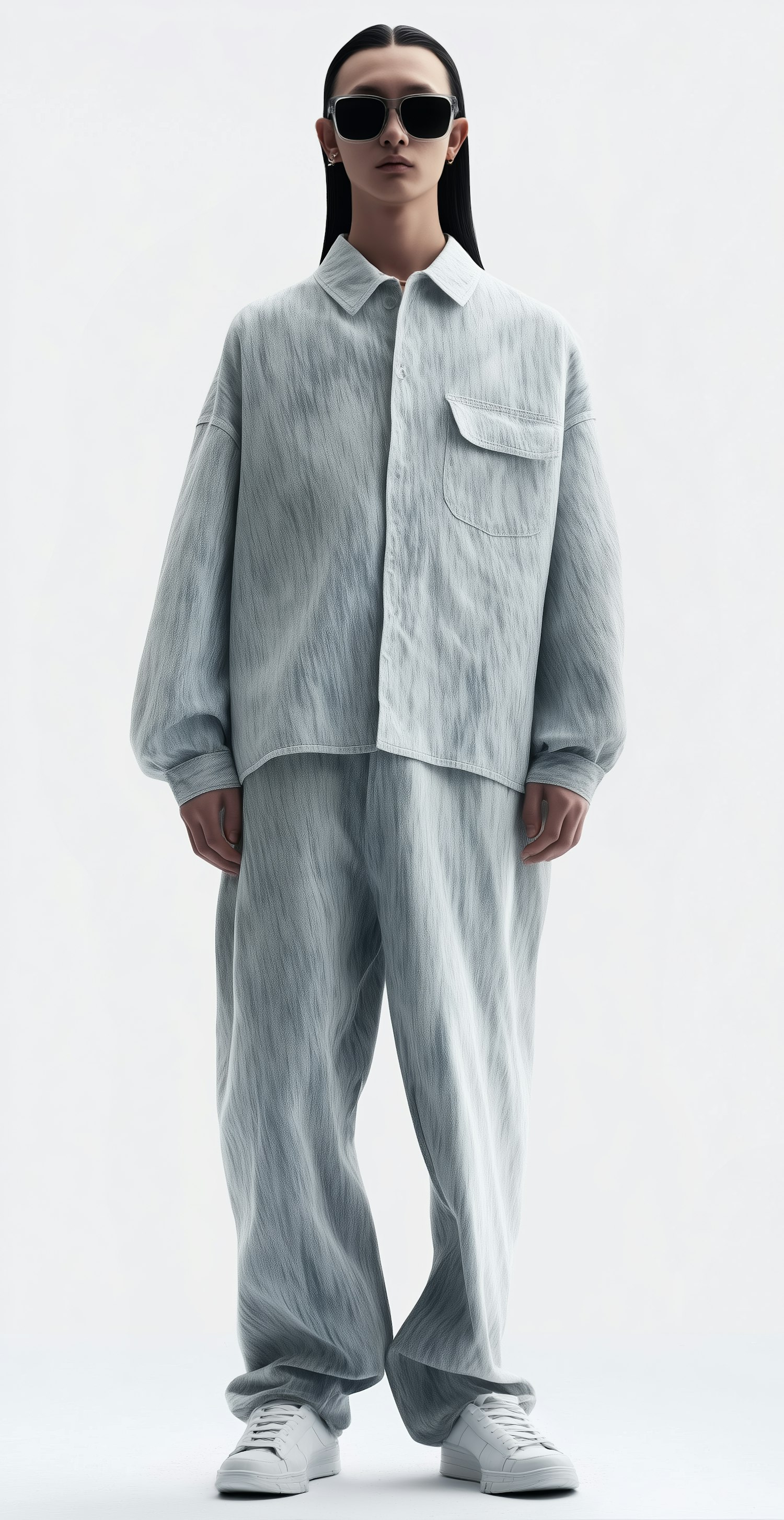 Stylish individual in a coordinated light outfit with sleek black hair and sunglasses, exuding a modern and minimalist aesthetic.