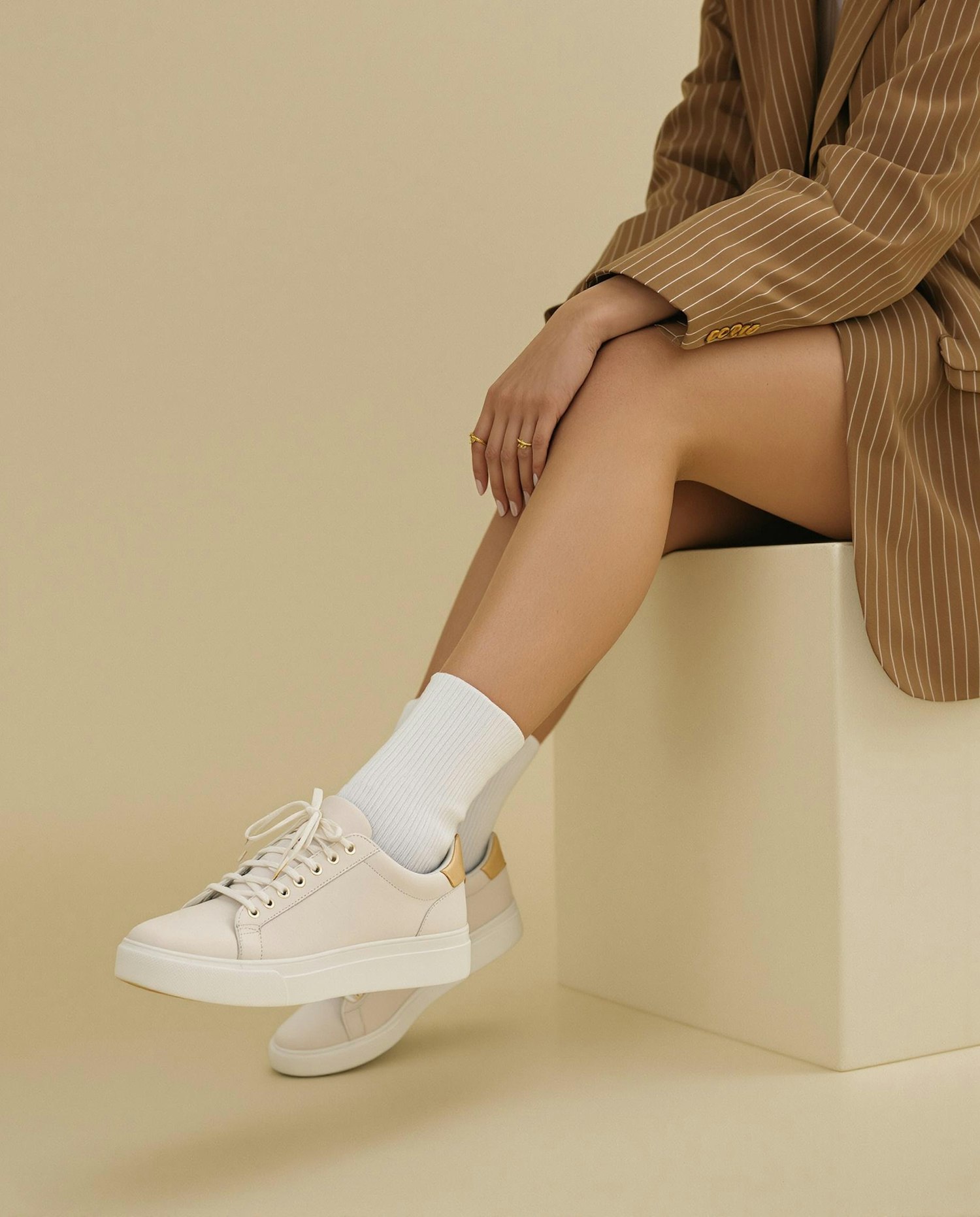 Minimalist fashion shot of crossed legs in a tan blazer, white sneakers with gold accents, and ribbed socks against a beige backdrop.
