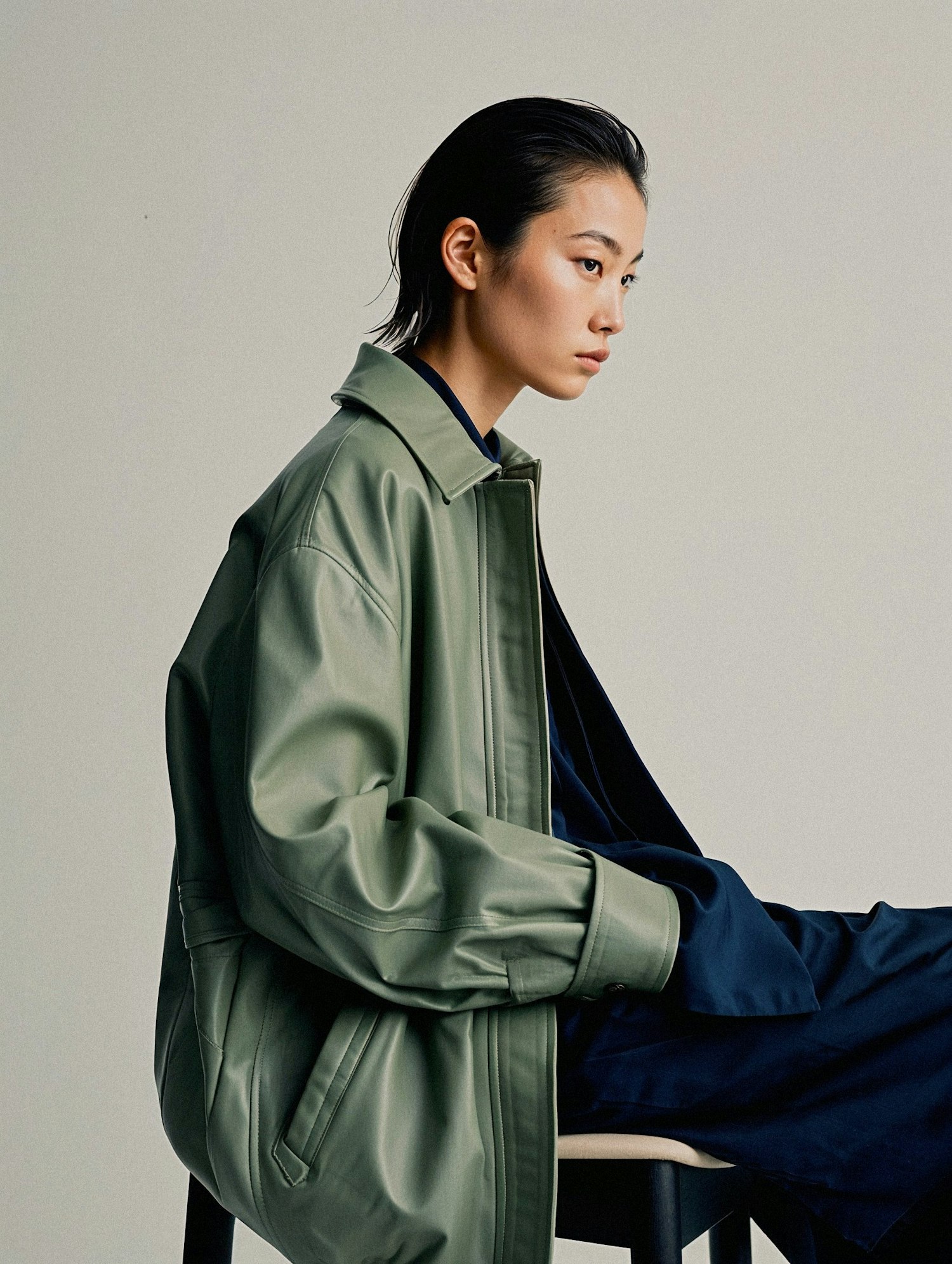 Minimalist portrait of a woman in a sage green jacket and navy outfit, sitting in profile against a neutral background.