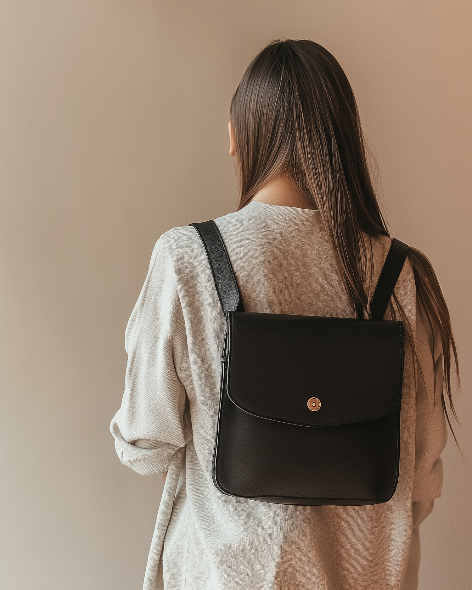 Woman with long brown hair wearing a beige sweater and a black leather backpack, set against a neutral background.