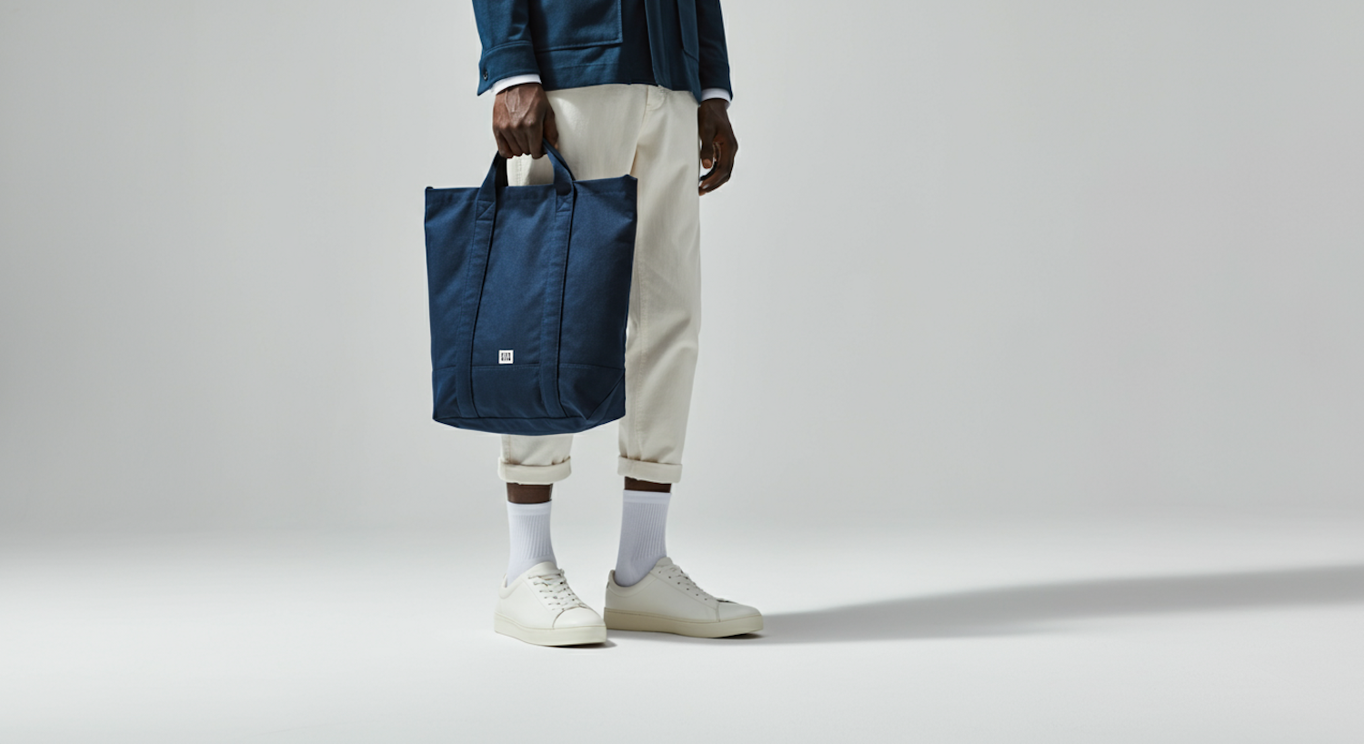 Stylish navy blue tote bag paired with a minimalist, modern outfit featuring off-white pants, white sneakers, and rolled cuffs.
