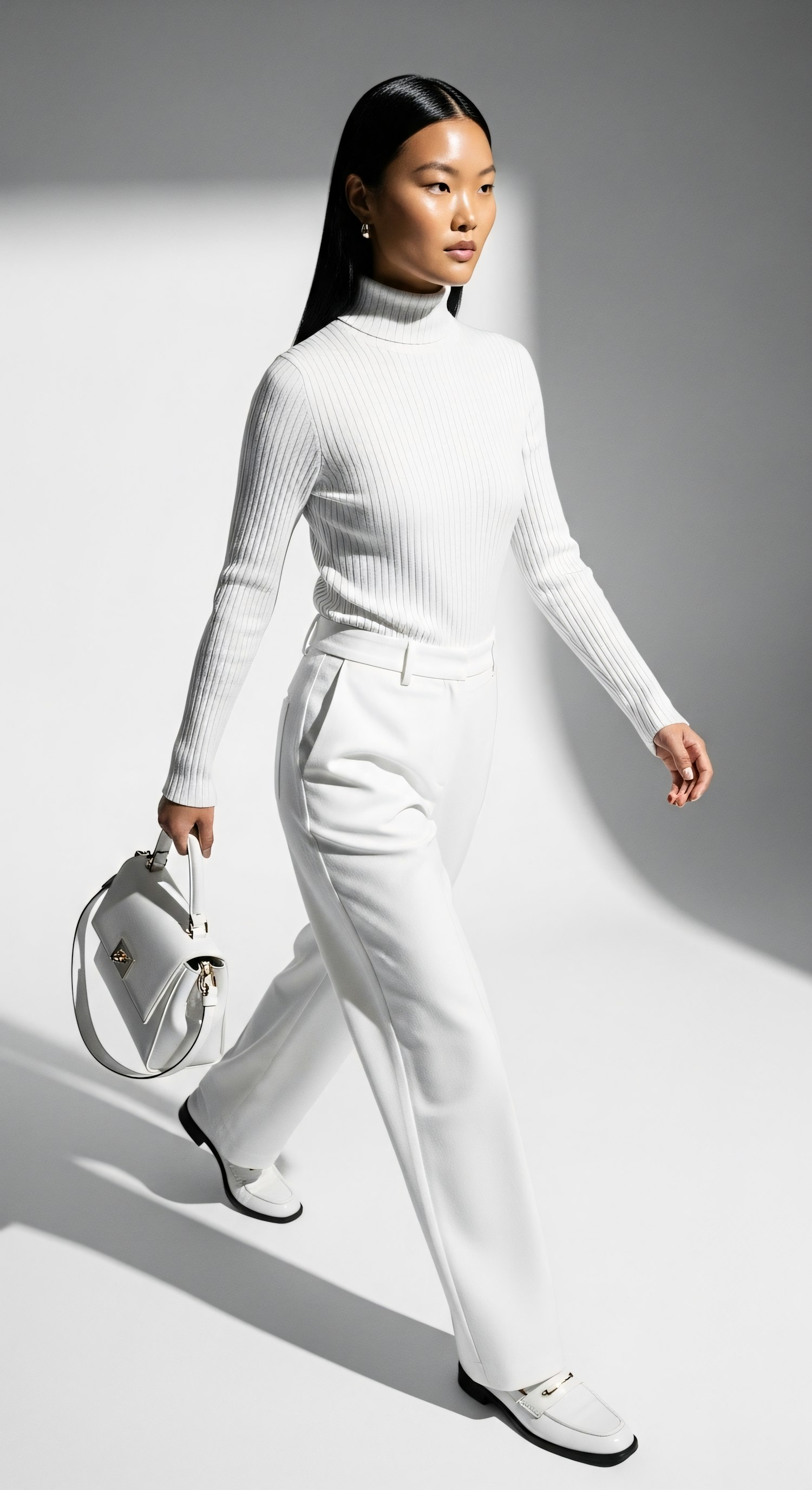 A stylish woman in a white outfit walks confidently, carrying a matching handbag. The minimalist setting highlights her modern look.