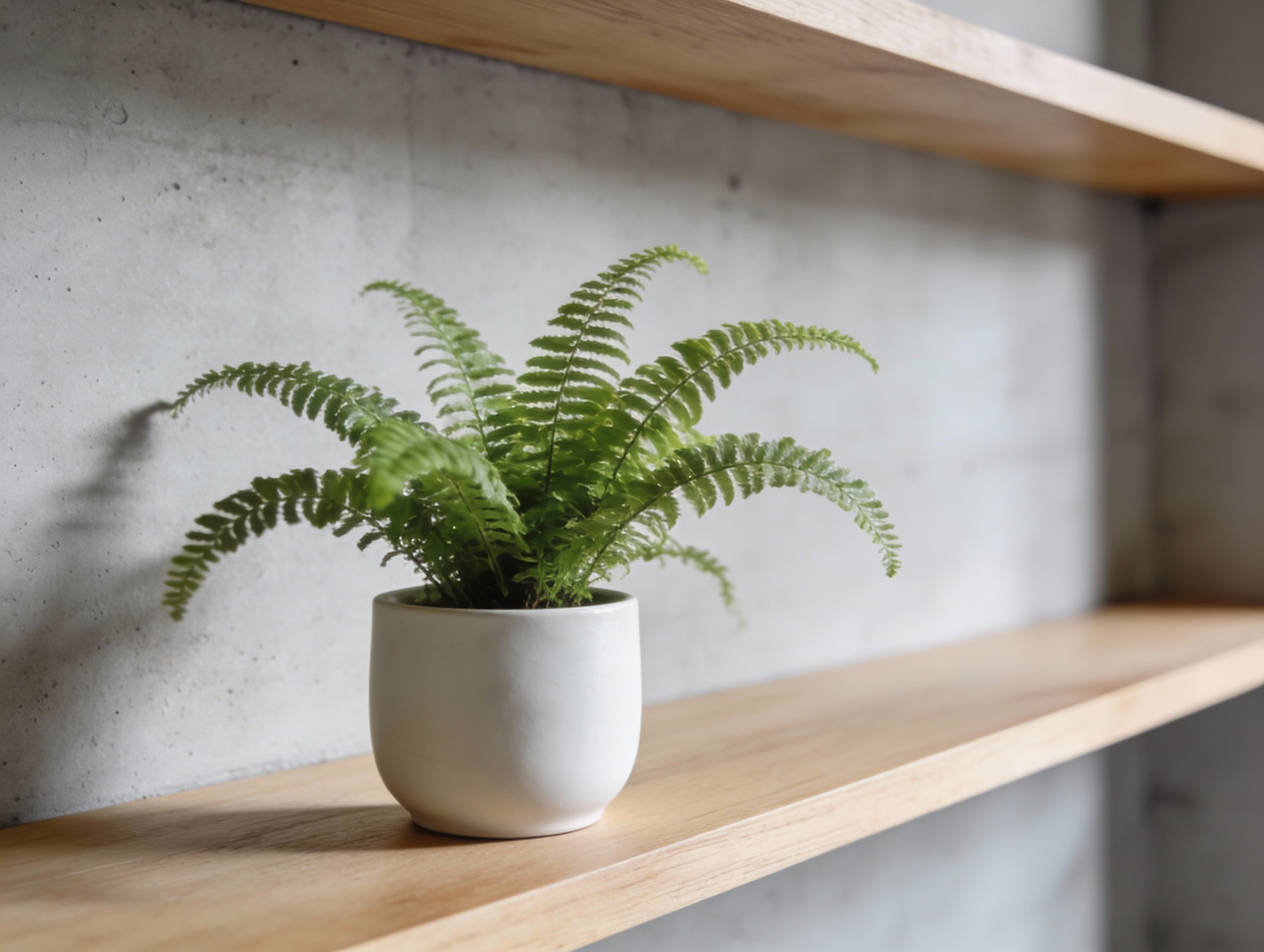 A vibrant green fern in a white pot sits on a wooden shelf against a concrete wall, creating a minimalist and modern aesthetic.