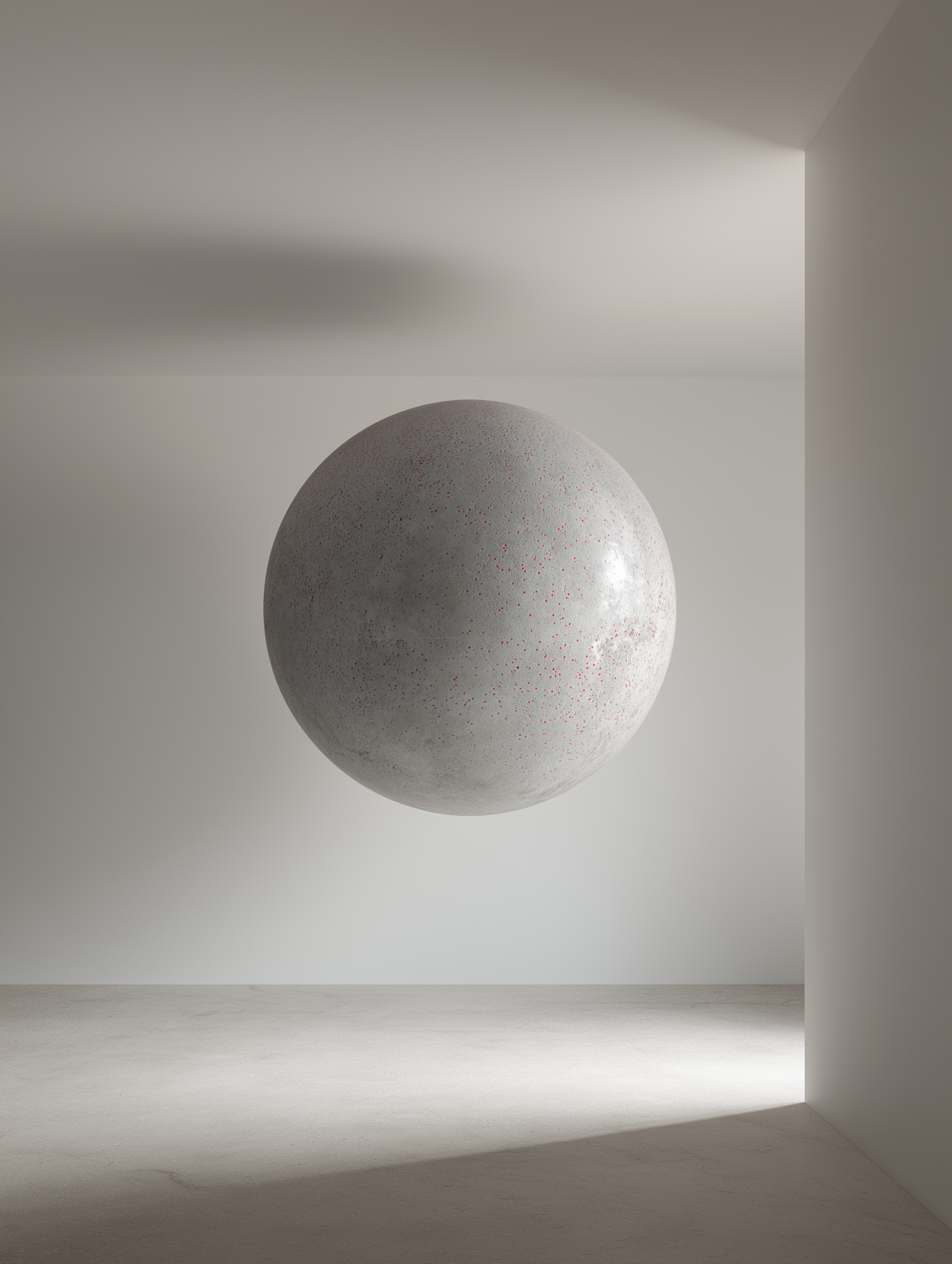 A floating textured sphere in a minimalist room with soft lighting and neutral tones, creating a modern and abstract visual.