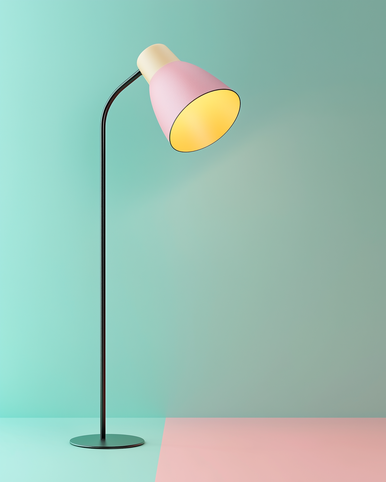 Minimalist floor lamp with pink and cream shade, warm yellow light, and pastel mint and pink background for a modern aesthetic.