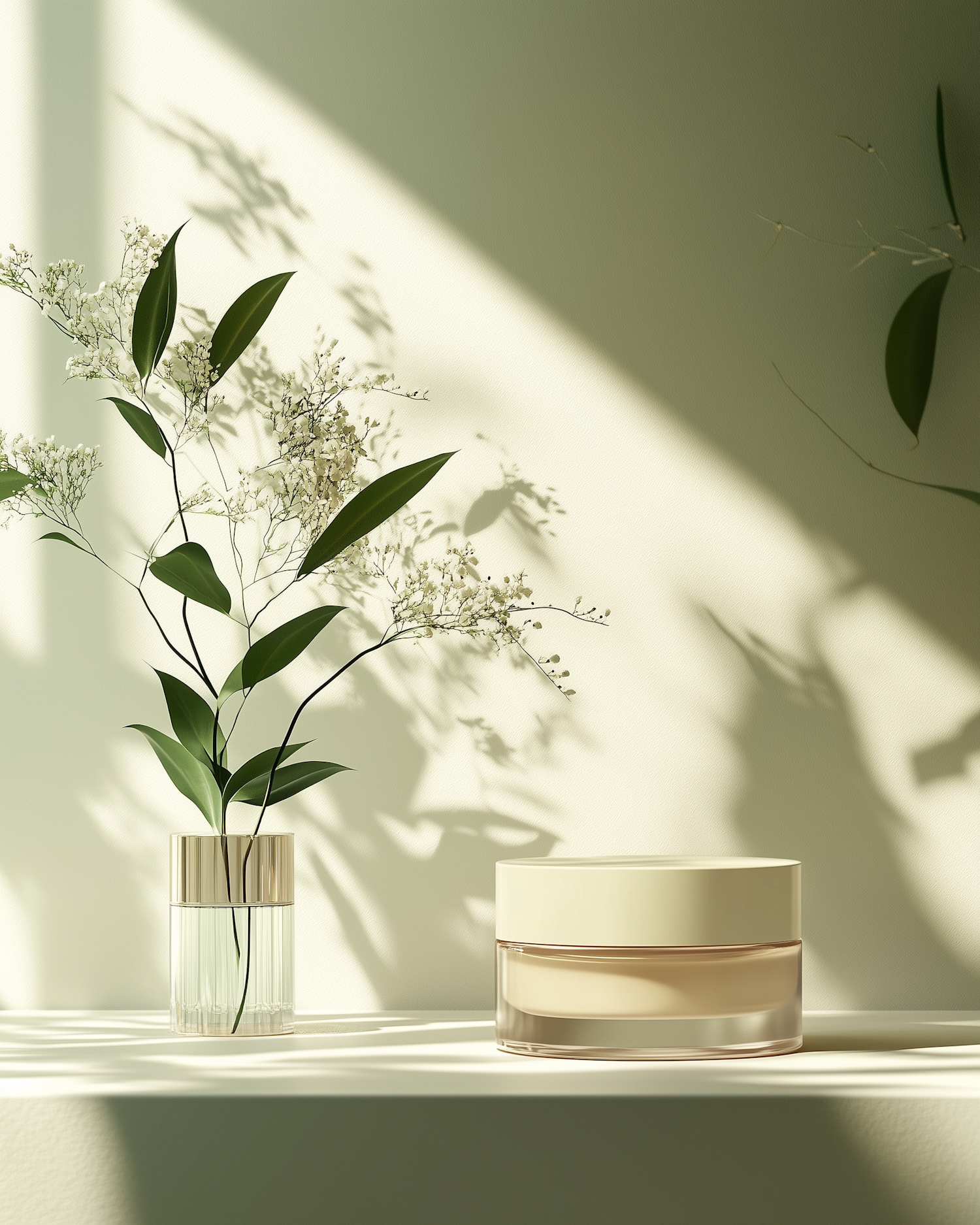 Minimalist scene with a glass vase of white flowers and a cream cosmetic jar on a light green background.