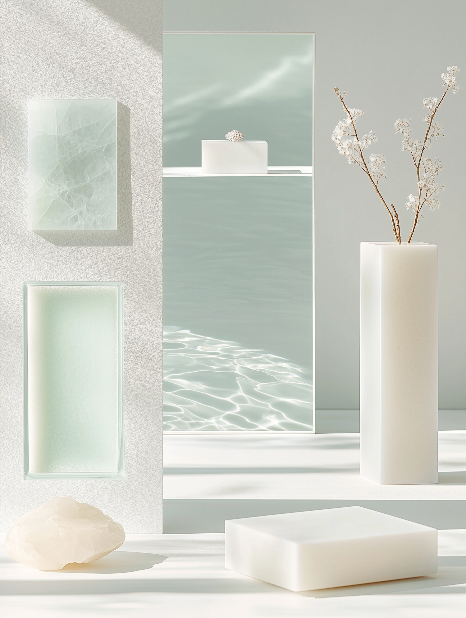 Minimalist scene with geometric shapes, soft pastels, and natural elements. Features translucent panels, a stone, and a vase with flowers.