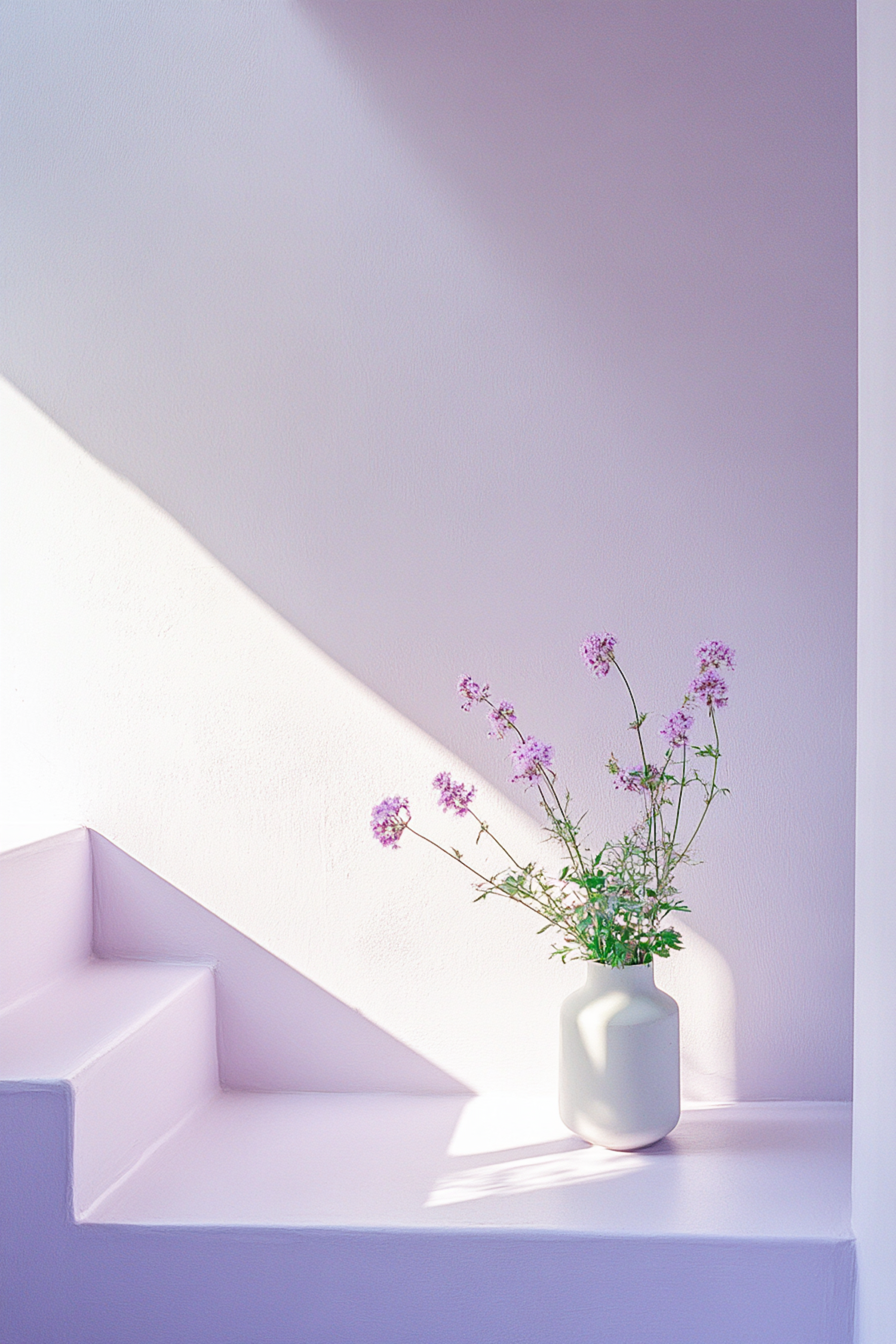 A white vase with purple flowers on a pastel lavender step, bathed in soft sunlight and sharp shadows for a minimalist, serene vibe.