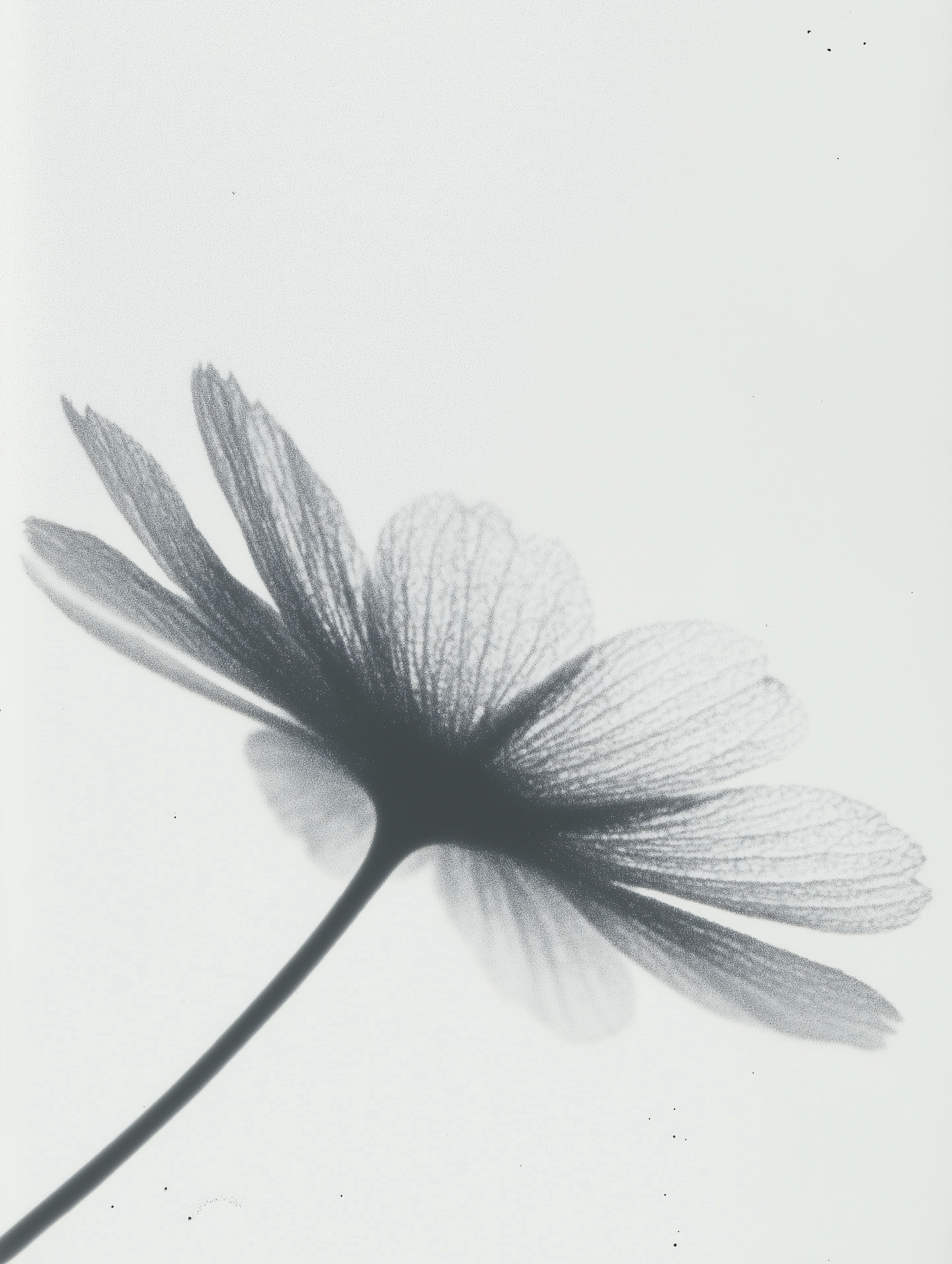 Minimalist black-and-white flower silhouette with translucent petals and intricate vein patterns on a soft gray background.