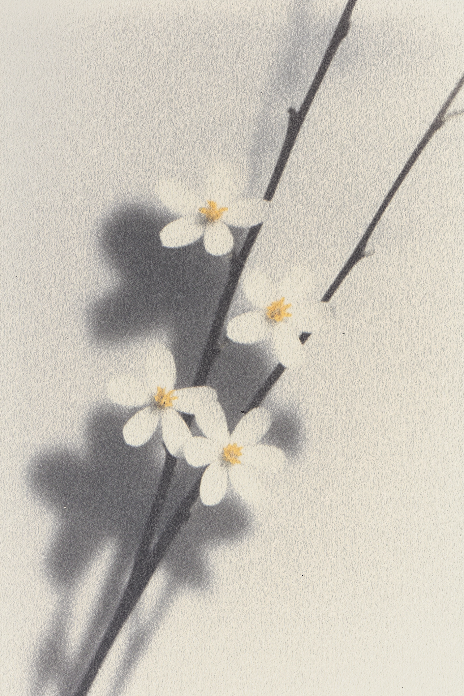 Minimalist floral branch with white flowers and yellow centers casting soft shadows on a textured light gray background.
