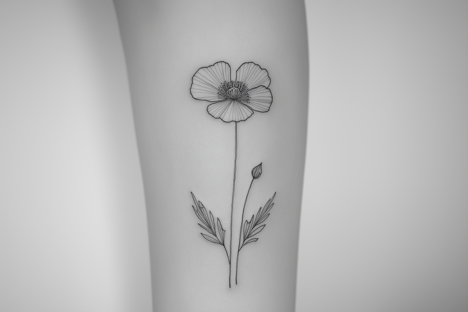 Minimalist flower tattoo with fine black lines, featuring a bloom, bud, and leaves on pale skin. Simple and elegant design.