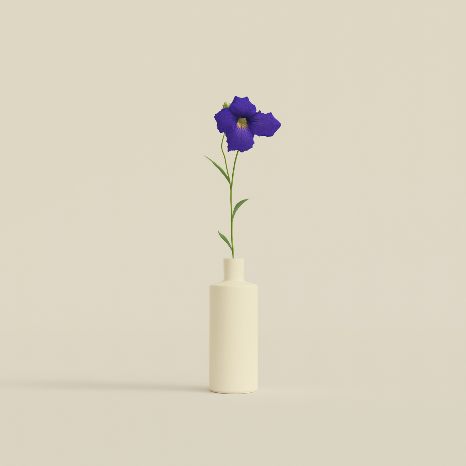Minimalist design with a vibrant violet flower in a cream vase against a neutral beige background. Simple and elegant decor.
