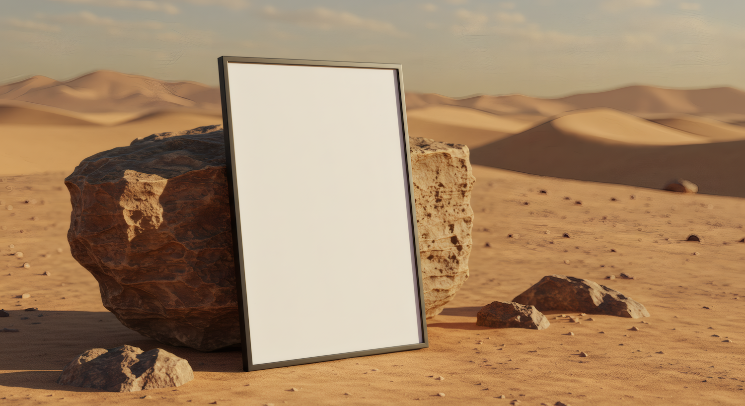 A blank white frame leans against a rock in a desert, surrounded by sand and dunes under a warm, partly cloudy sky.