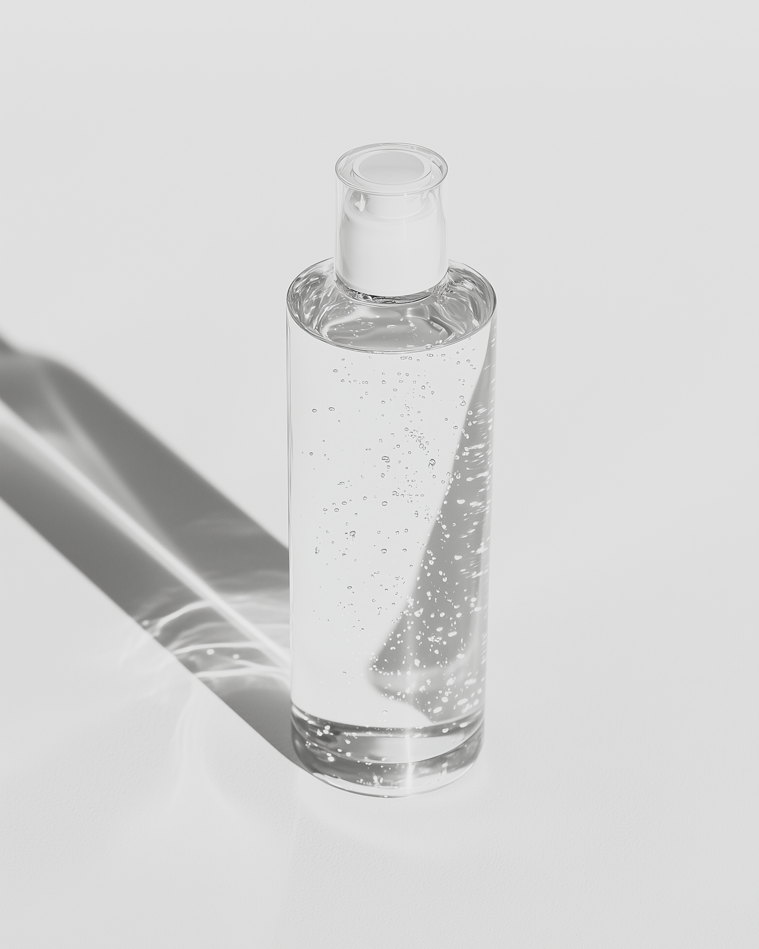 Minimalist clear bottle with gel and bubbles, white pump dispenser, and soft shadows on a bright white background. Clean and modern design.