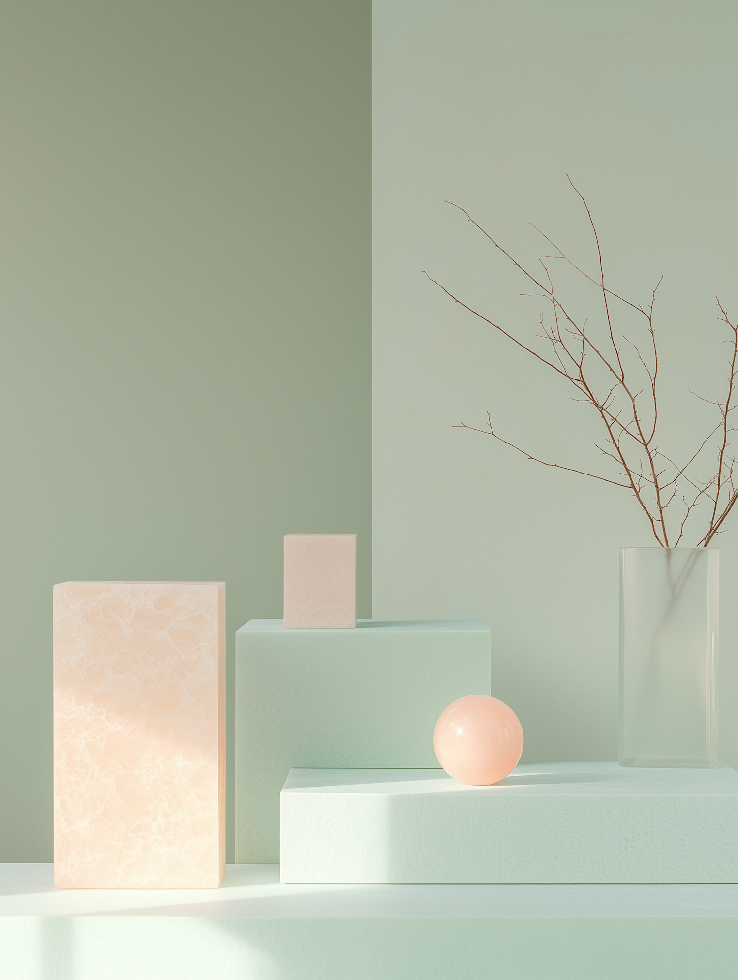 Minimalist scene with peach geometric shapes and a vase with branches on a mint green background.