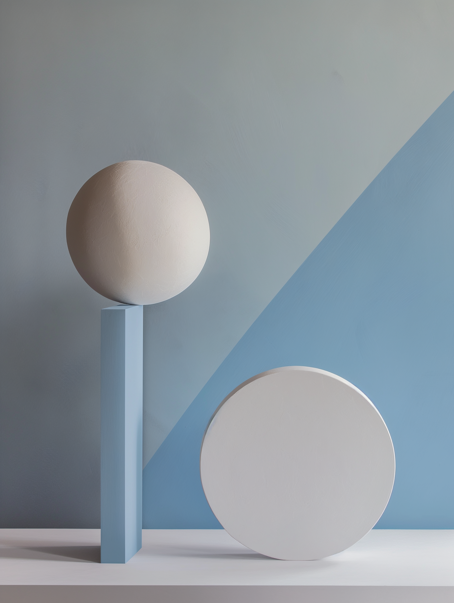 Minimalist geometric art with a white sphere on a blue column and a white disc against a soft blue-gray background.