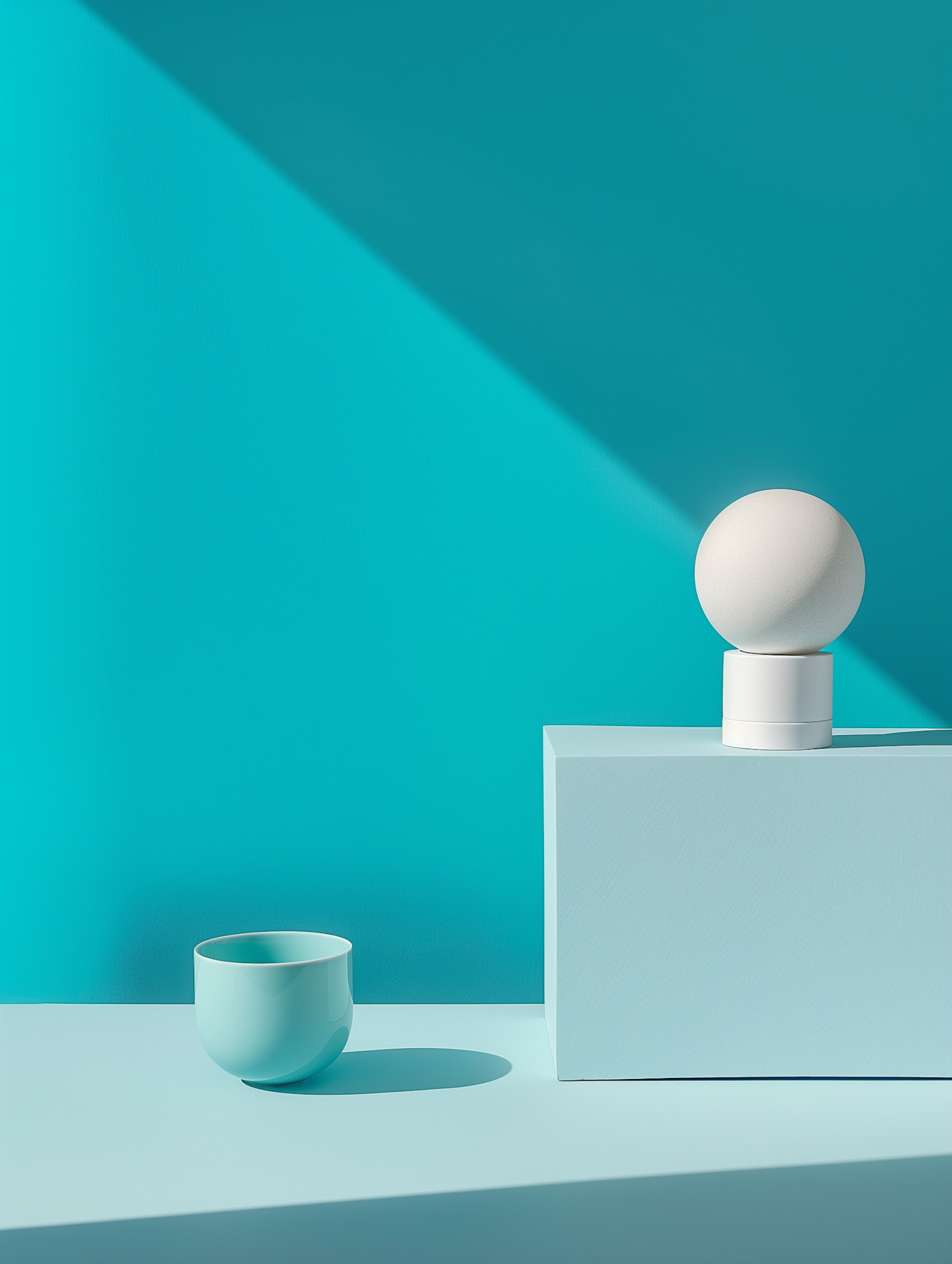 Minimalist scene with a blue cup and geometric shapes against a teal background, featuring strong shadows and a modern aesthetic.