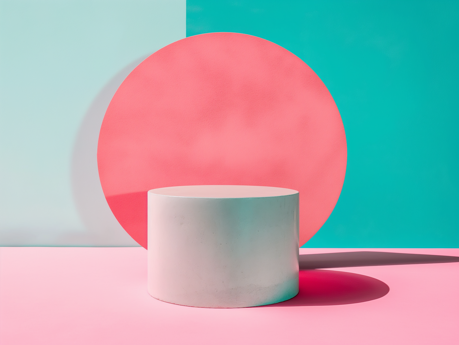 Minimalist abstract scene with a gray cylinder, coral circle, and turquoise background. Bold geometric shapes and vibrant colors.