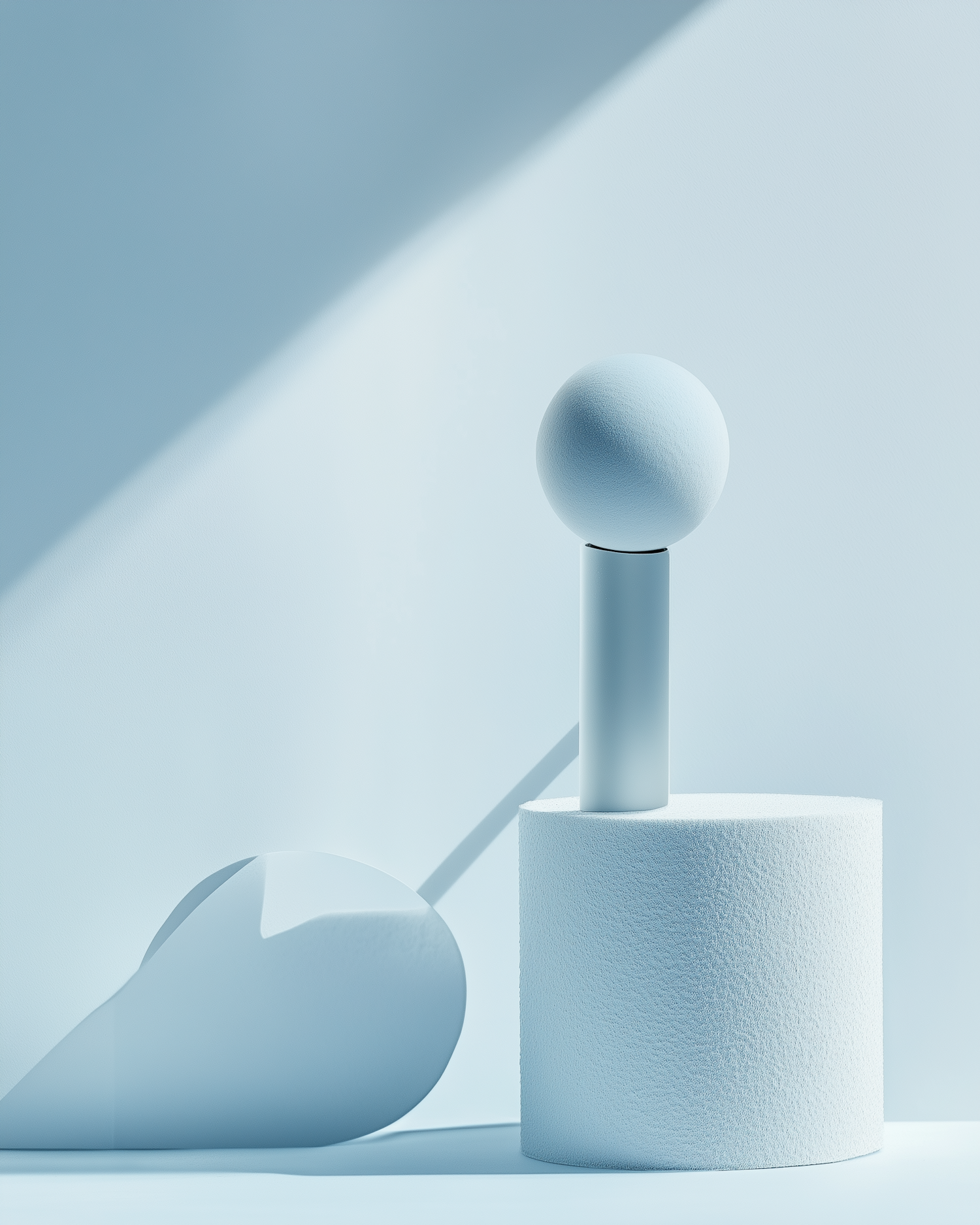 Minimalist light blue composition with a sphere on a cylindrical pedestal, casting soft shadows. Modern geometric design.