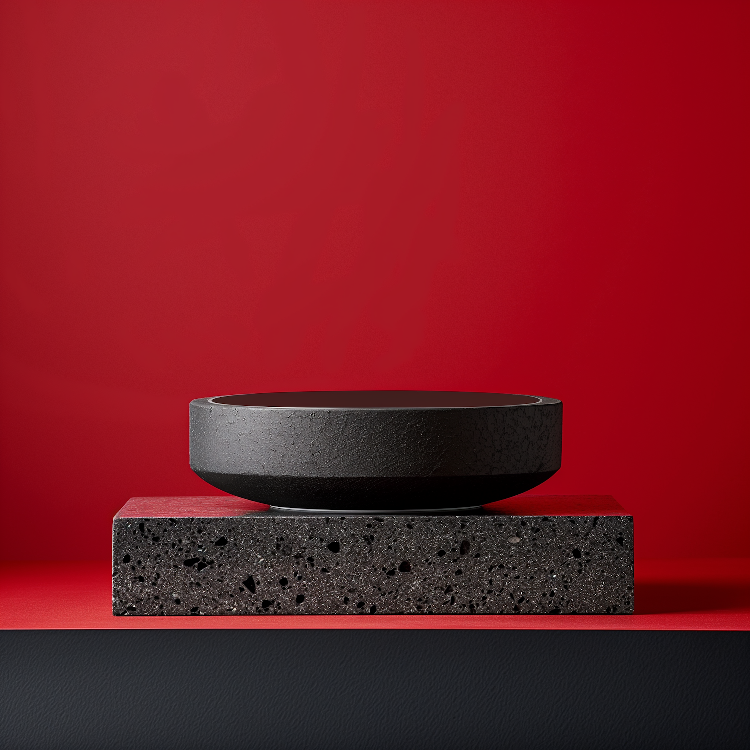 Minimalist black bowl on a speckled block against a bold red background, highlighting textures and geometric shapes.