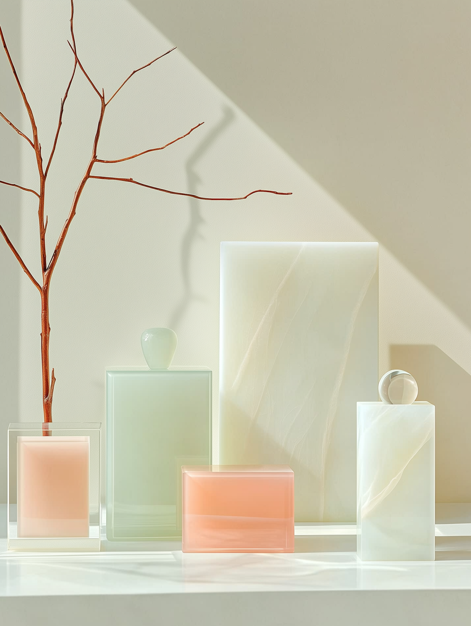 Minimalist pastel geometric objects with a bare branch on a white surface, set against a soft beige background with elegant lighting.