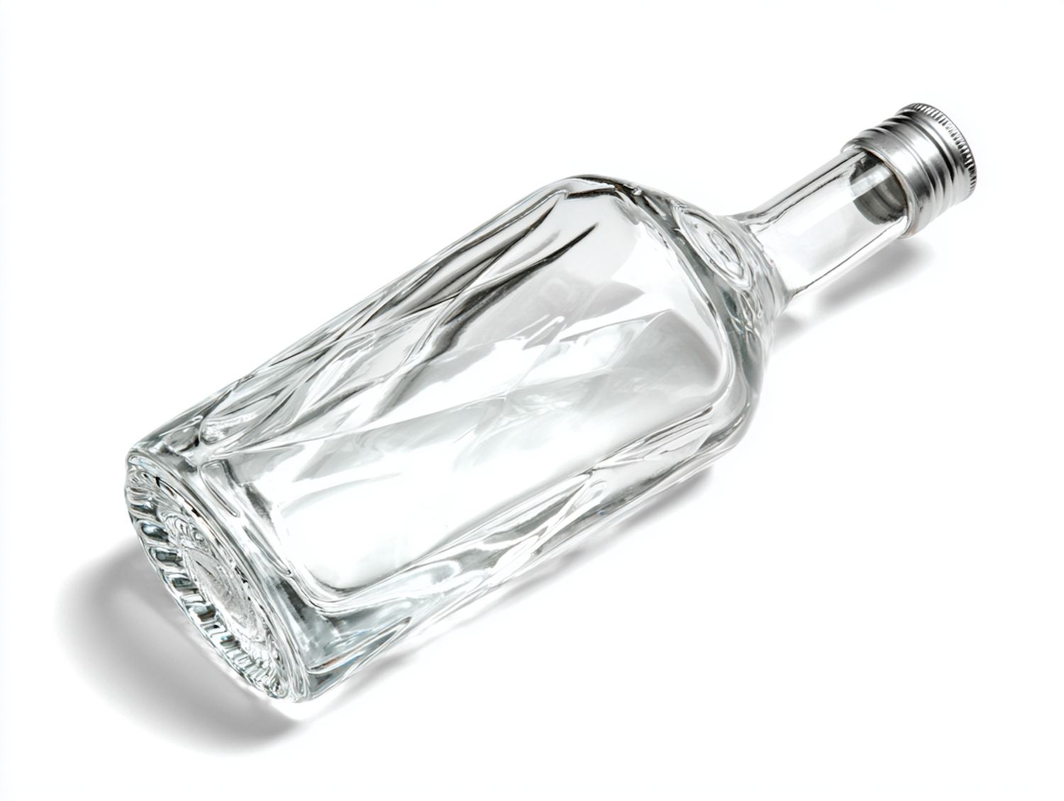 Transparent glass bottle with metallic screw cap lying on white surface, showcasing a simple and sleek design ideal for liquids.