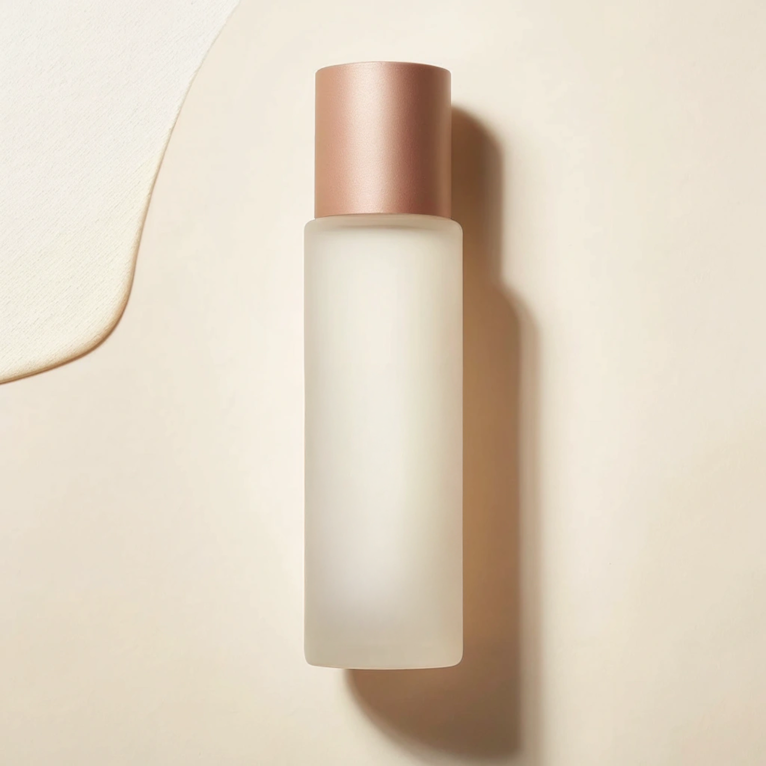 Minimalist frosted glass bottle with a rose gold cap on a beige background, paired with a creamy smear for a modern aesthetic.