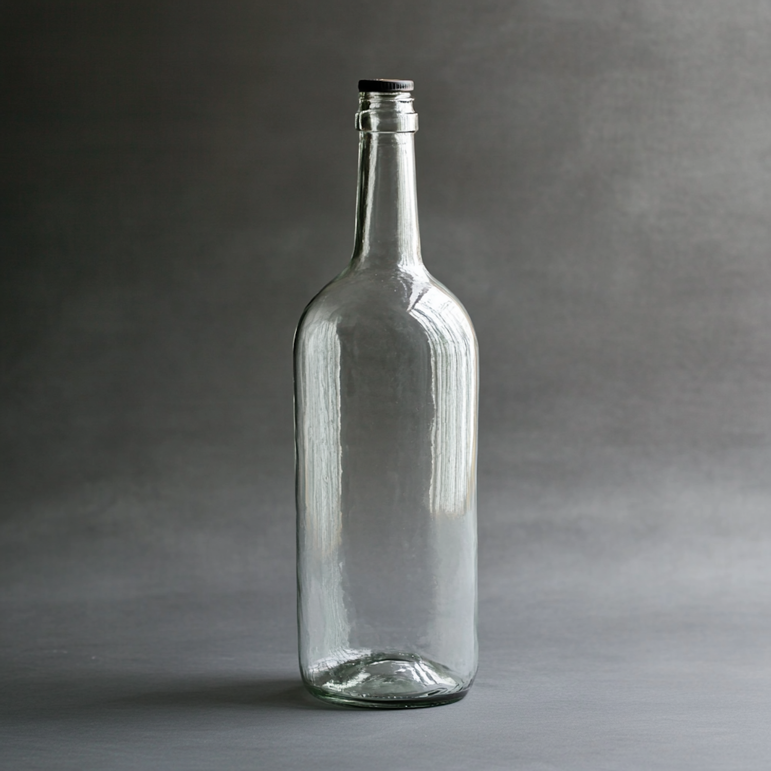 Clear glass bottle with a dark cap against a gray background, showcasing minimalist design and elegant contours.