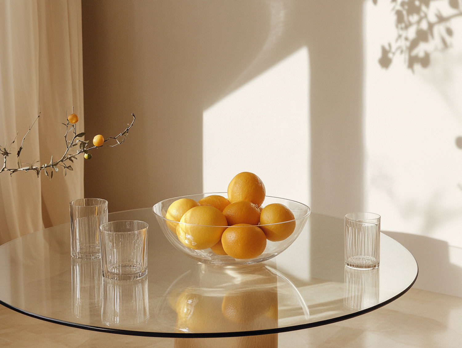 Minimalist glass table with oranges in a bowl, textured glasses, and a branch in warm sunlight casting soft shadows.