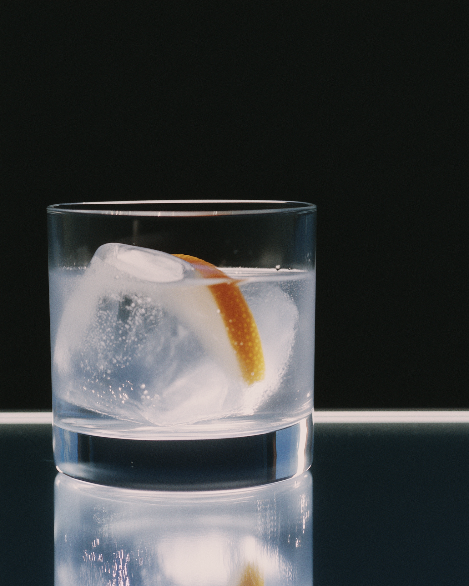 A sleek glass with a citrus garnish and ice cube, set against a black background. Perfectly minimal and refreshing vibes.