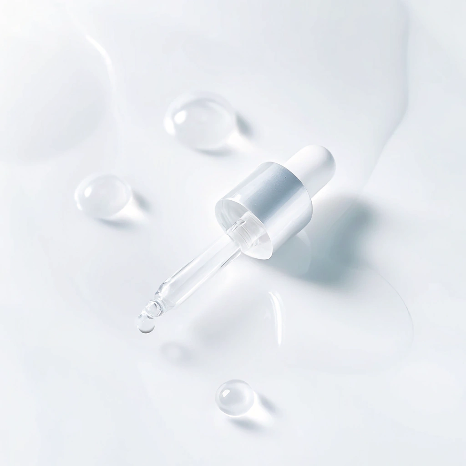 Minimalist image of a clear glass dropper with liquid droplets on a glossy white surface, perfect for skincare or cosmetic themes.