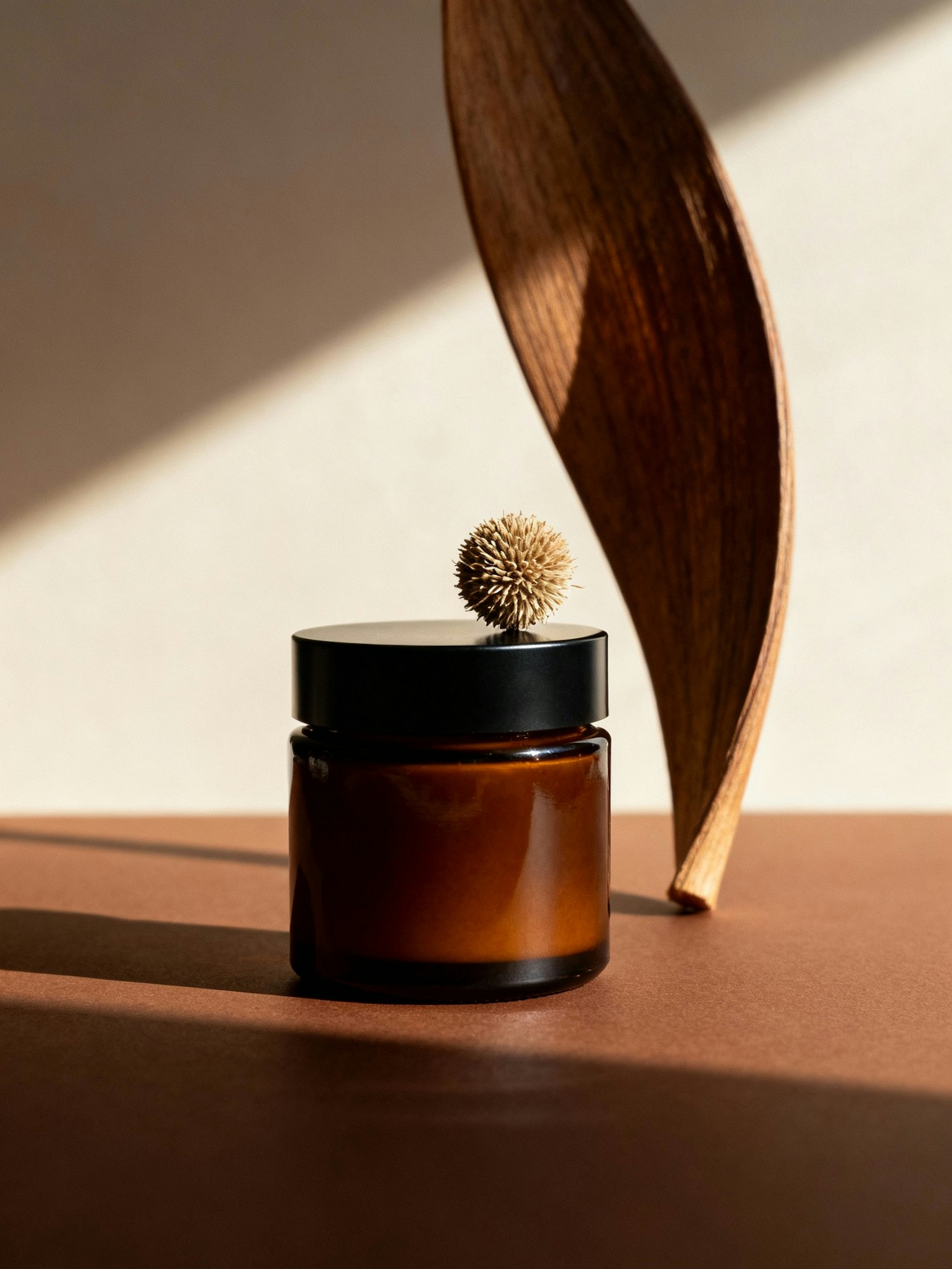 Studio product photography in a refined, sculptural, and organic art direction — matte amber glass packaging with a black lid, minimalist and label-free, placed against a warm brown studio background. The lighting is soft, directional, and diffused from one side, creating gentle shadows and a natural sense of depth. The overall atmosphere is earthy and calm, with warm tones, tactile textures, and a poetic balance between raw materials and crafted elegance. Style inspired by high-end skincare campaigns — natural sophistication, sensory minimalism, and sculptural composition. A minimal still life with a single amber jar on a flat brown surface, a sphere of dried seed resting on its lid, and a curved wooden piece in the background. The composition feels perfectly balanced, evoking serenity and quiet luxury.