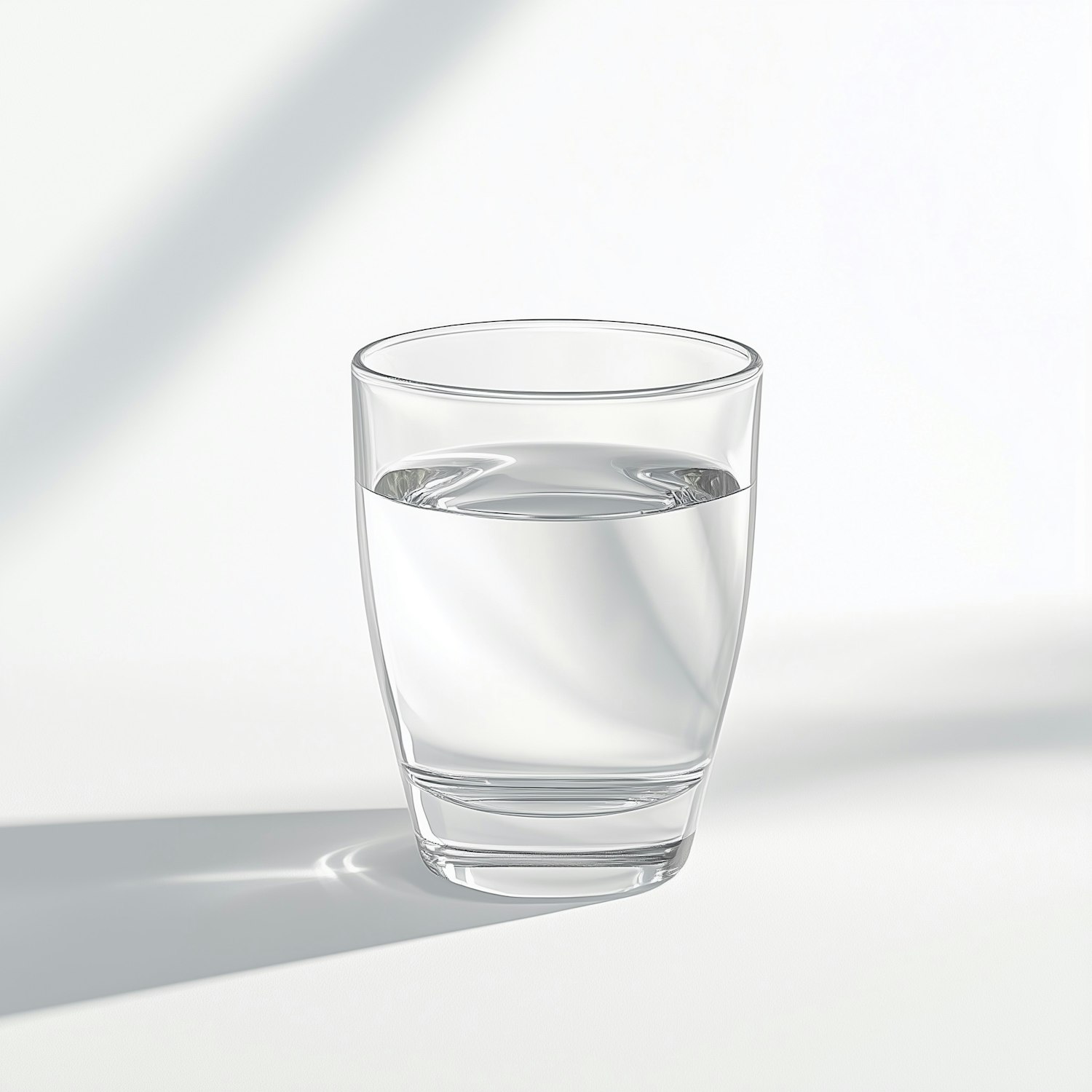 A clean, minimalist shot of a clear glass of water on a white surface, with soft lighting and subtle shadows for a modern aesthetic.