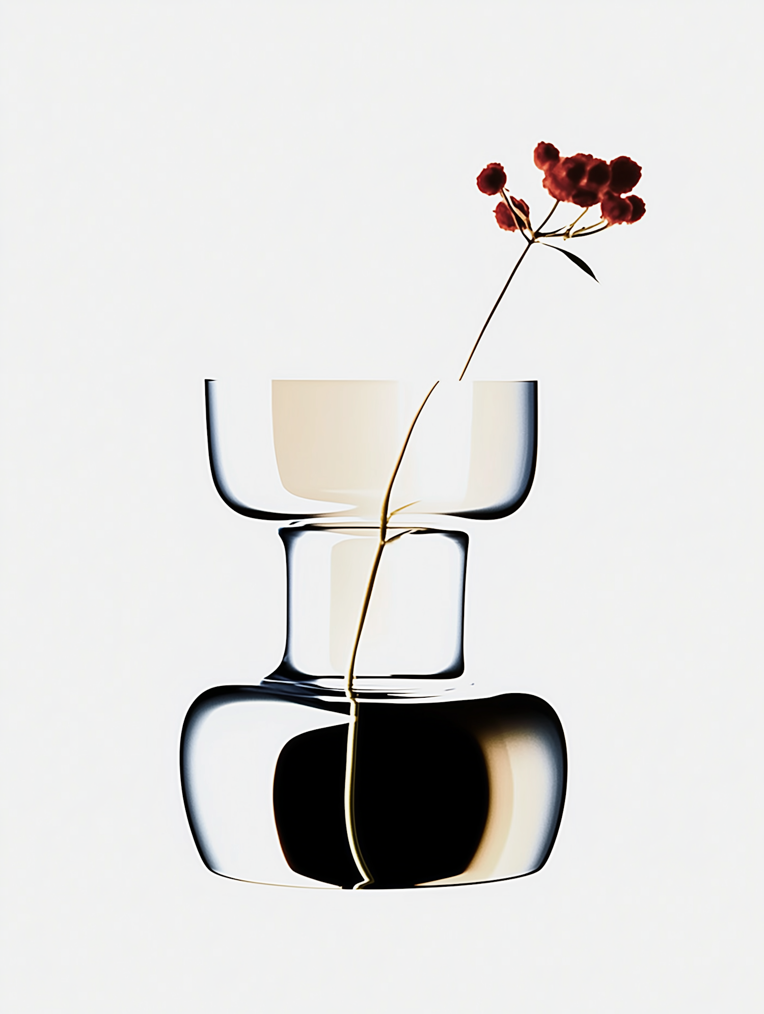 Minimalist glass vase with red flowers on a neutral background, showcasing elegance and modern design.
